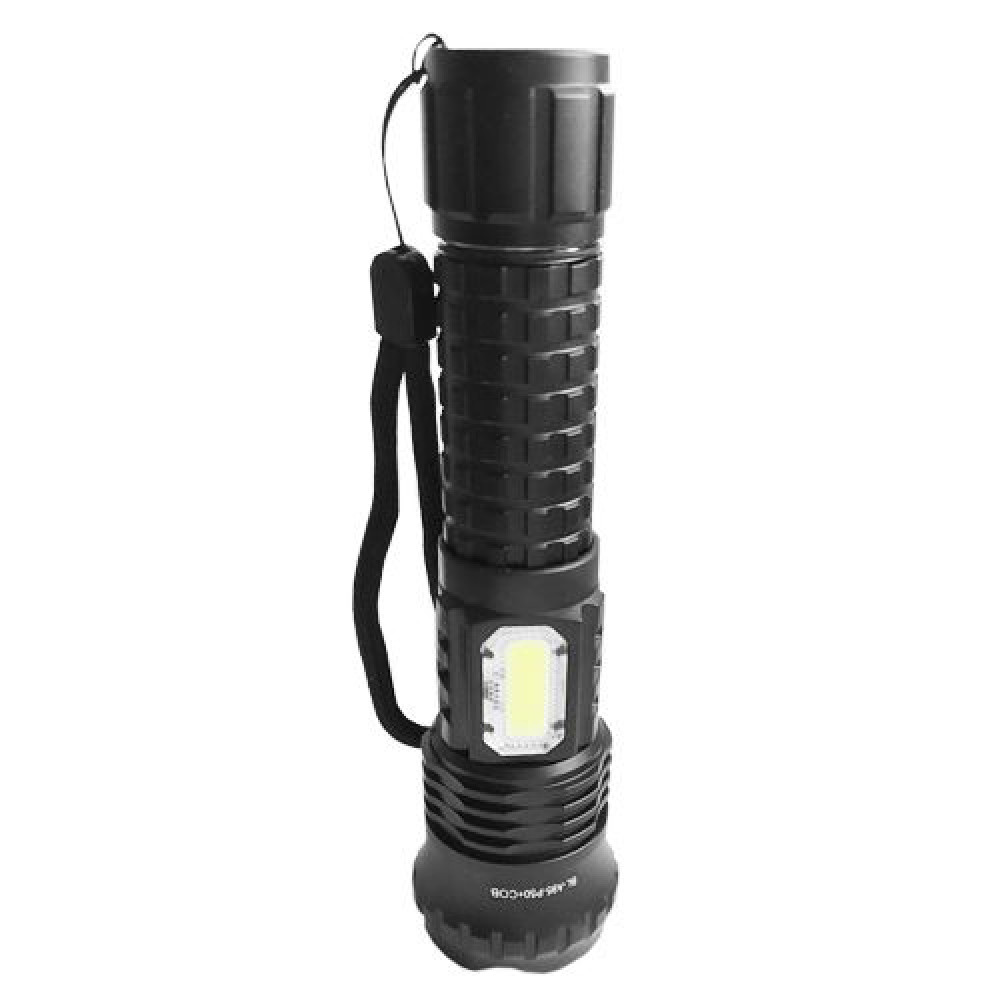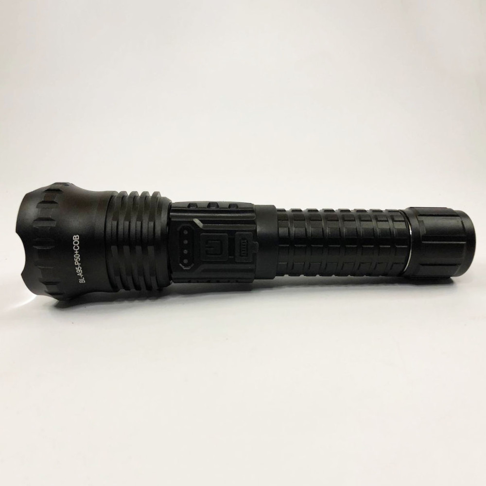 Потужний ліхтарик BL-A95-P50+COB з регульованим зумом пучка світла та п'ятьма режимами свічення у компактному, вологозахищеному та удароміцному металевому корпусі з алюмінієвого сплаву.