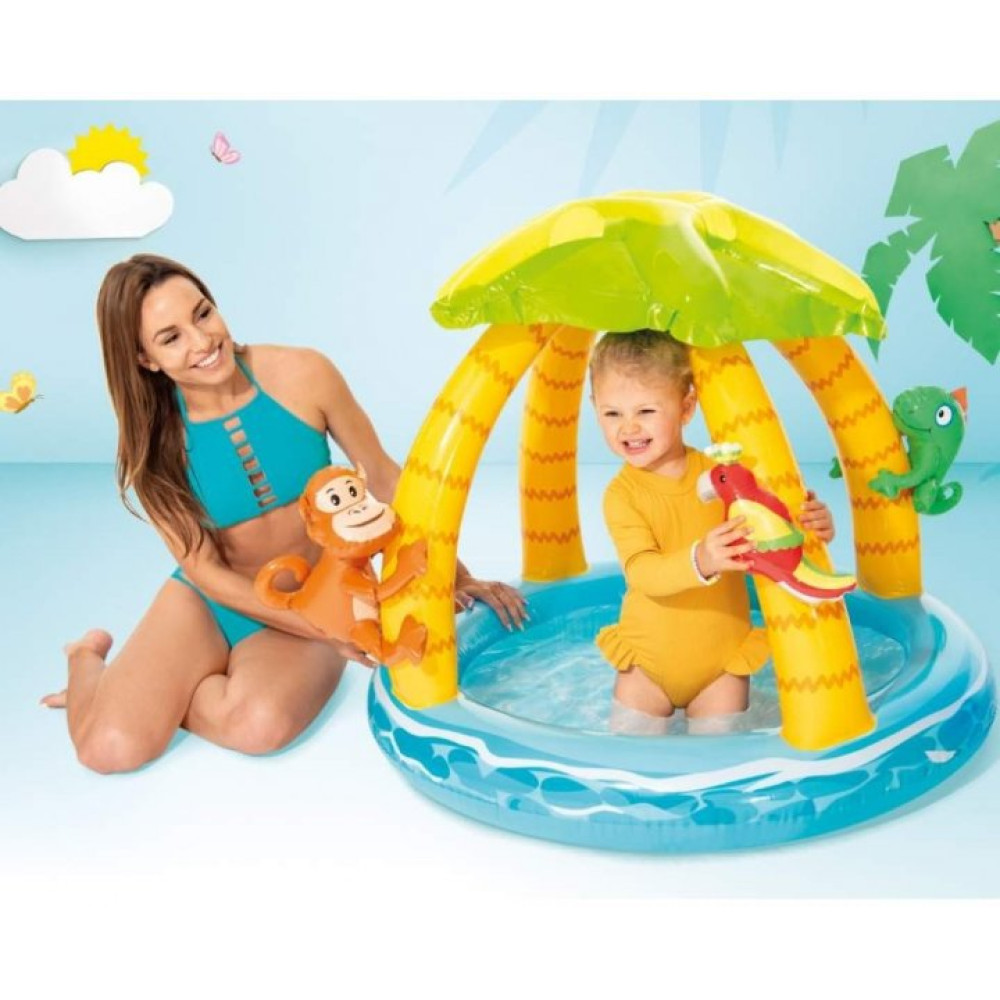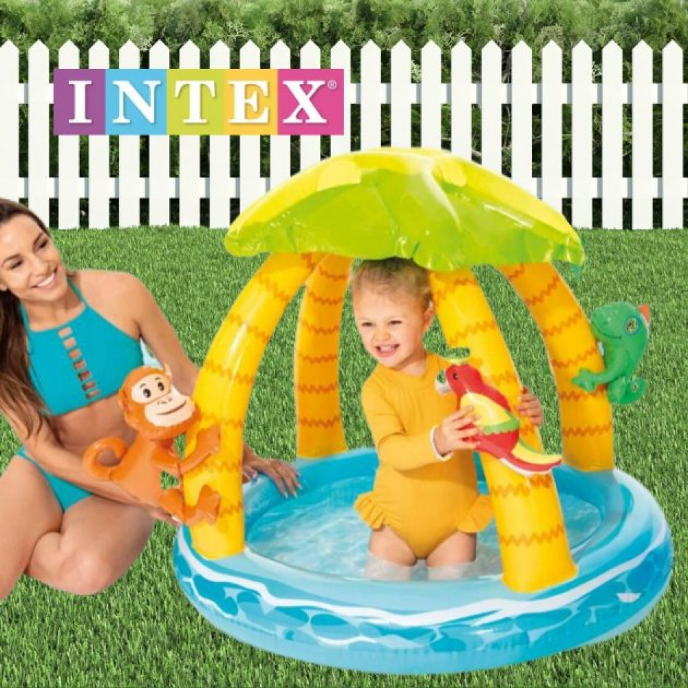 Intex 58417 – гарний дитячий басейн невеликої глибини (висота бортиків 13 см), оснащений навісом, що дозволяє захистити від дитини від яскравих сонячних променів. Модель виконана у вигляді тропічного острова з тваринами та птахами, має товсті надувні борти. Басейн виконаний із міцного ПВХ товщиною 0,25 мм.