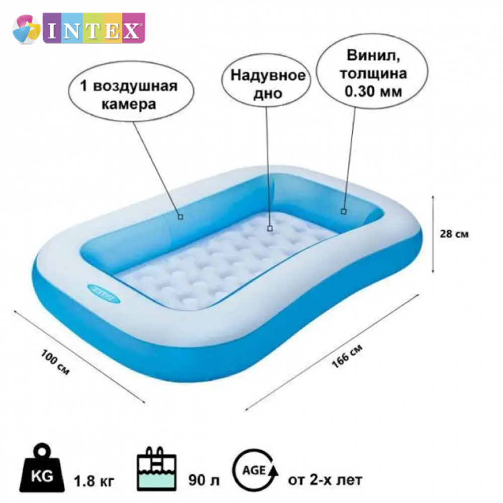 Дитячий басейн – це багато годин веселих ігор у воді. Прямокутний басейн має надувне дно, тому маленьким діткам буде комфортно та м'яко у ньому грати.