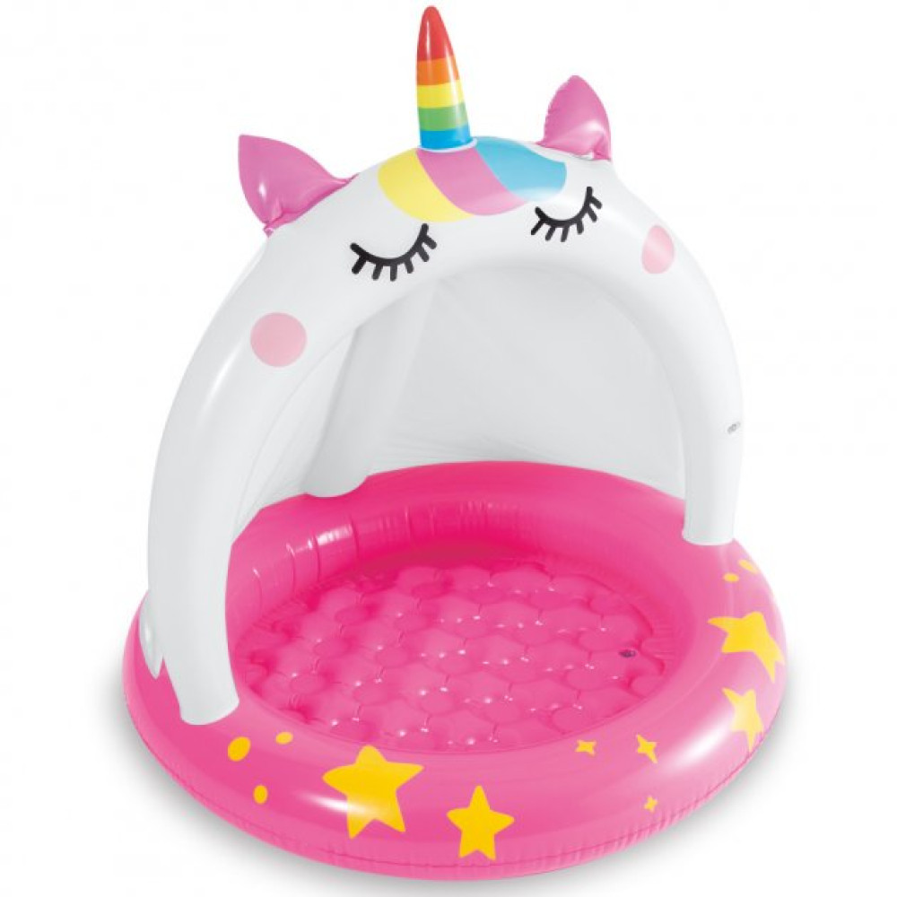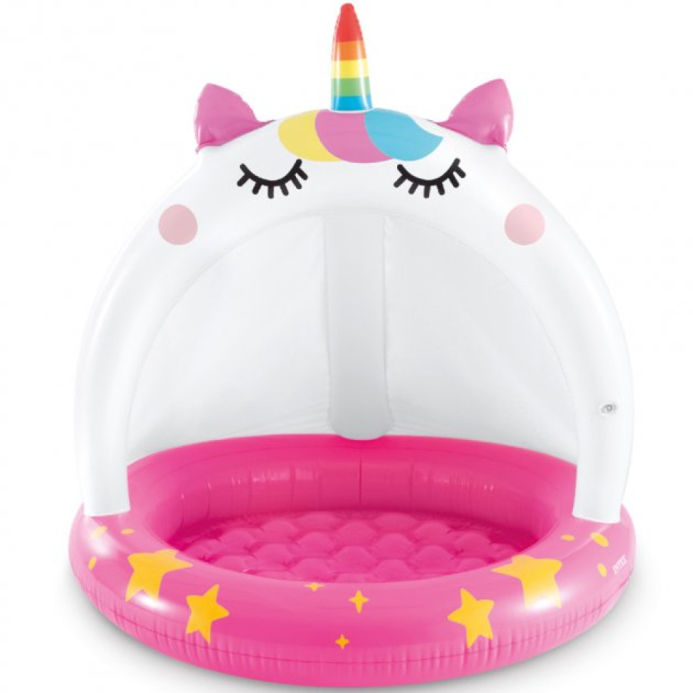 Він має дизайн Кота з рогом як у Єдинорога, який приверне увагу малюка та басейн перетвориться на улюблене місце Ігор. А його особливе забарвлення одразу викликає захоплення у дитини. Такий надувний басейн обов'язково стане окрасою будь-якої території. Завдяки унікальному оформленню басейн буде ще й гідним захистом для малюка від променів сонця. Для зручності дана модель йде з надувним дном і дитині було м'яко і тепло сидіти. Дитячий басейн виготовлений із якісного вінілу.