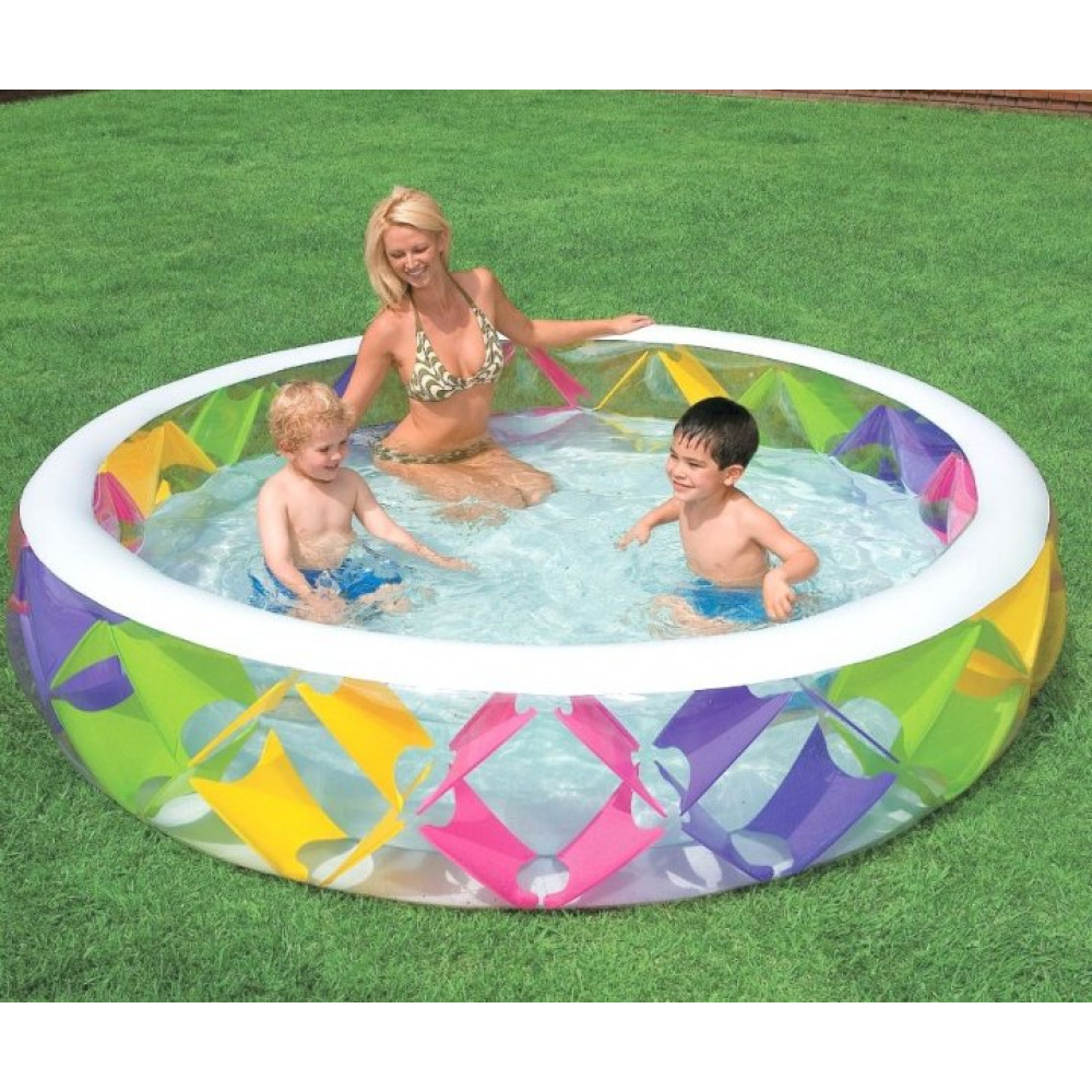 Модель створена в яскравому індивідуальному дизайні, безперечно створить гармонію на Вашій заміській ділянці. Її конструкція має м'які надувні стінки, які виконують функцію спинки і надувне дно, що є величезною перевагою. Місткість басейну дозволяє знаходитися в ньому одразу всій родині, якщо ваші діти вже досягли шестирічного віку, можна сміливо купатися разом із дітьми.