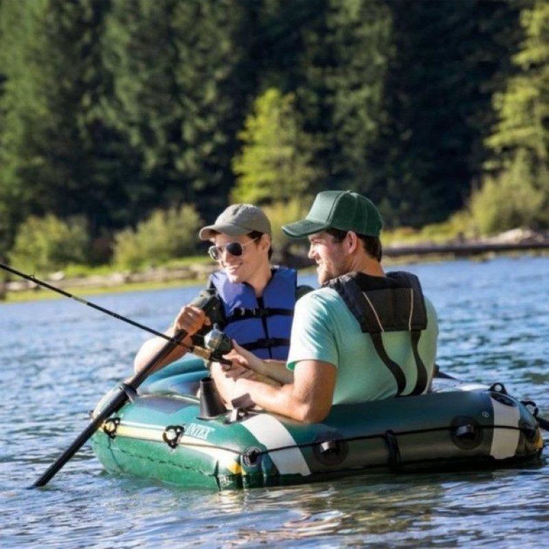 Надувний човен зеленого кольору від Intex має величезну популярність серед покупців. Човен виконаний з матеріалу Super Tough, товщина якого становить 0,50 мм.