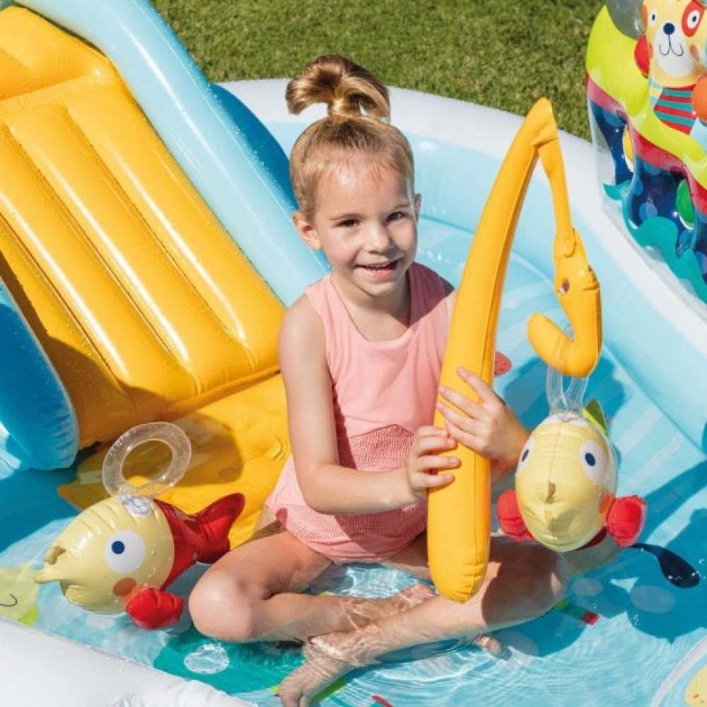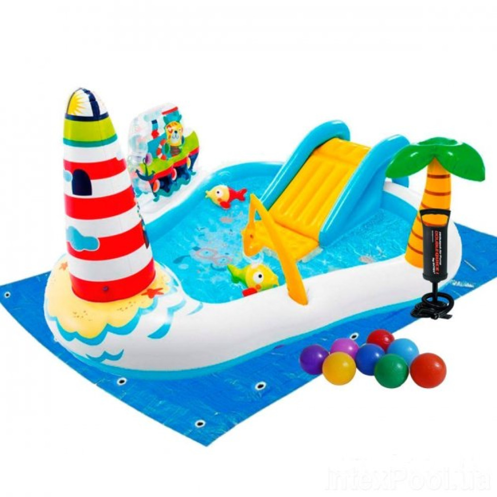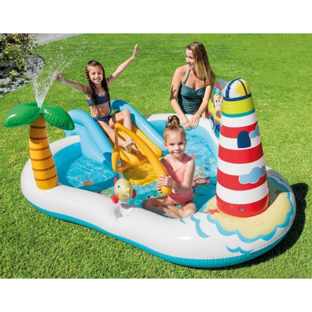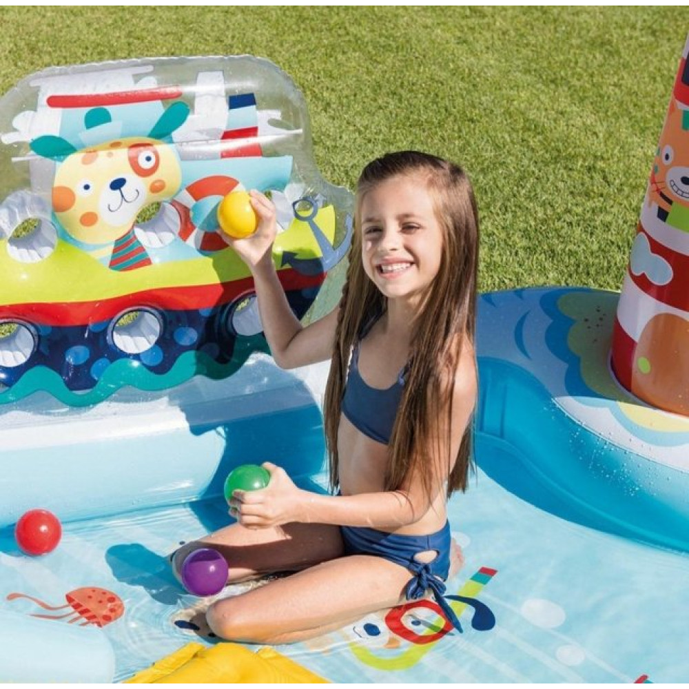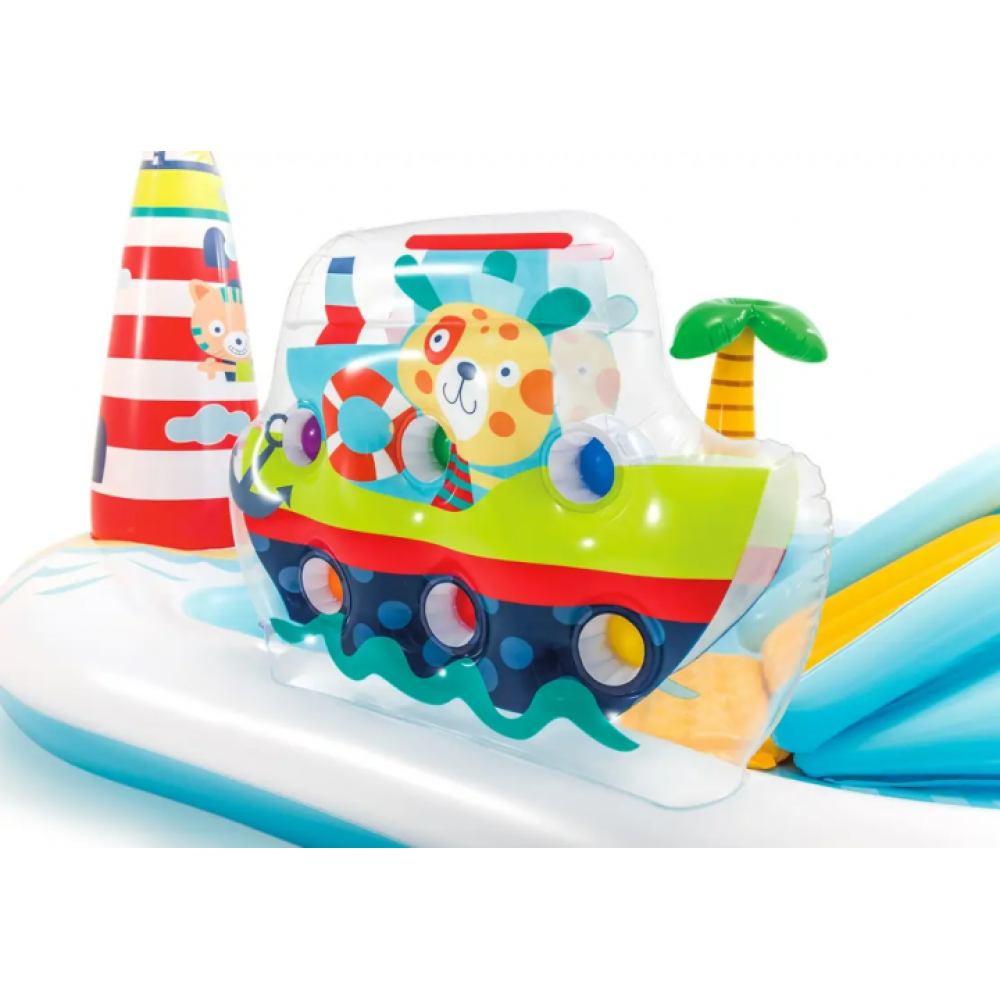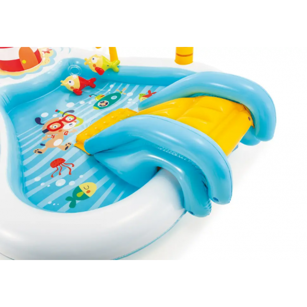 Купання у басейні передбачено для дітей віком від трьох років. Дитячий надувний ігровий центр відкритого типу, виконаний у формі трикутника, в ньому є надувна гірка, кульки, вудка та дві надувні рибки. Також передбачено пальмовий розпилювач, який кріпиться до садового шланга. Ігровий центр виконаний у яскравих тонах, які передають морську тематику.