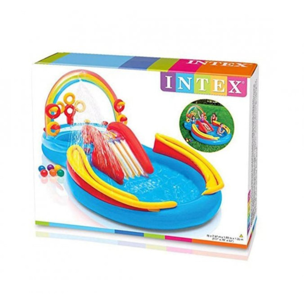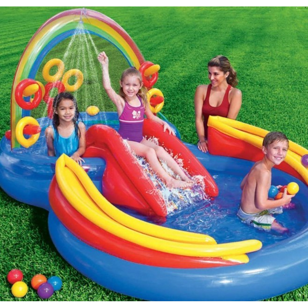 Раді представити вашій увазі супер класний дитячий надувний центр 57453 NP «Райдуга» від всесвітньо відомої торгової марки Intex! Ігровий центр «Райдуга» - це справжнісінький аквапарк на вашому задньому дворі.