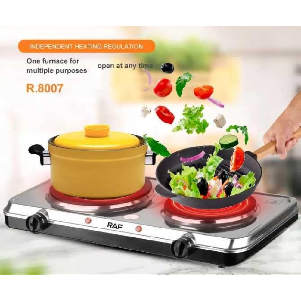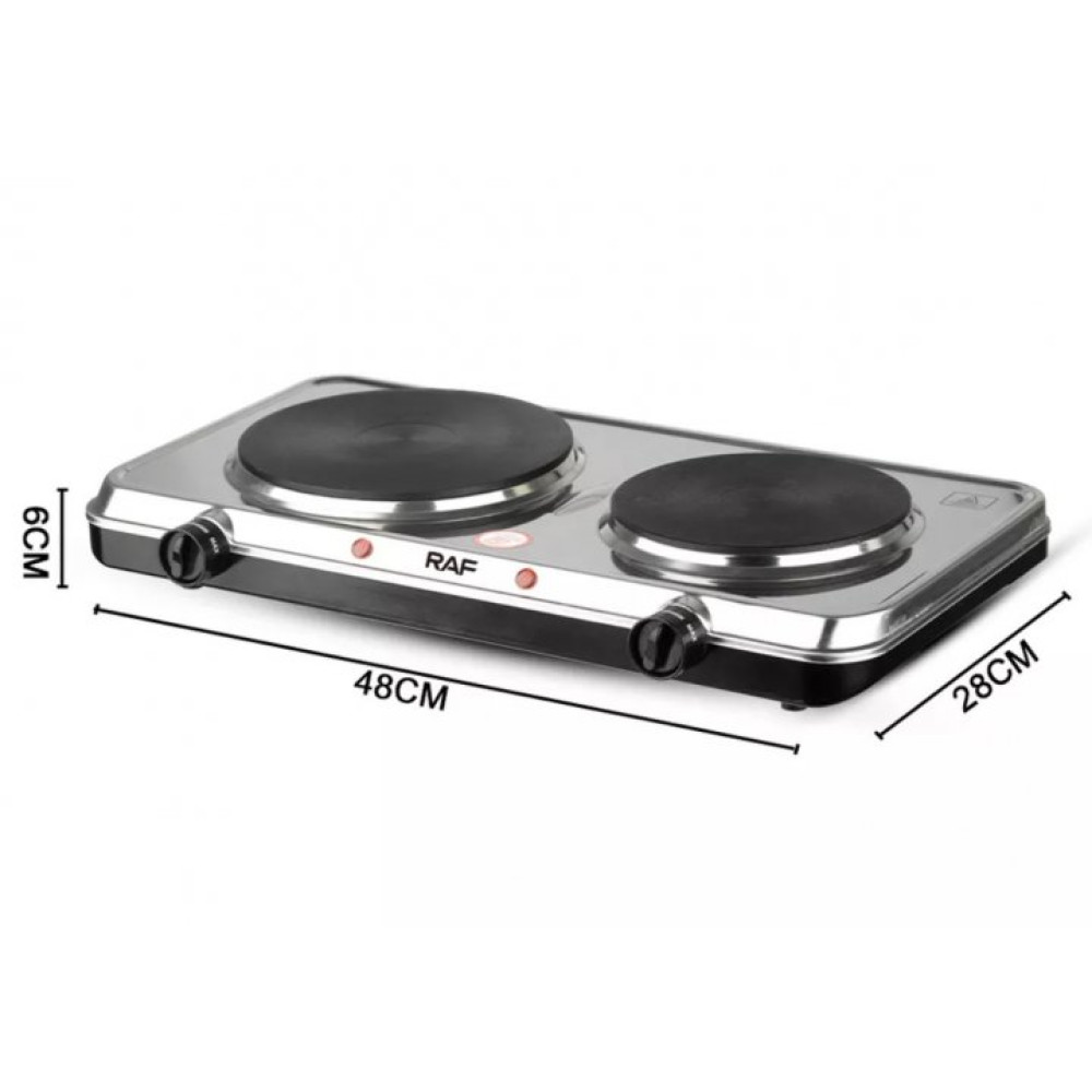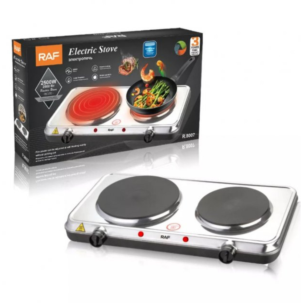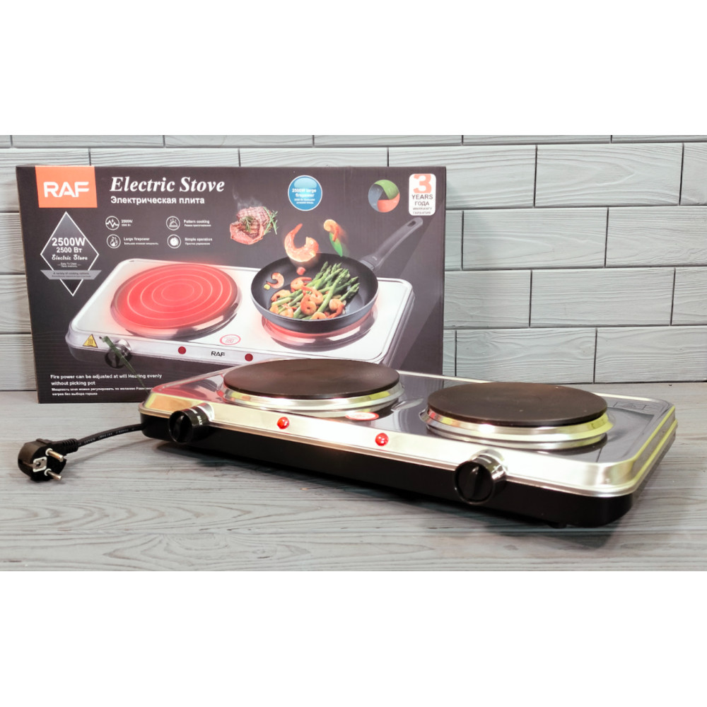 Чавунні диски електроплити RAF R.8007 мають різний розмір - 165 мм та 130 мм. За допомогою потужності 2500Вт, варильна поверхня розігрівається дуже швидко. Її максимально можлива температура коливається не більше 500 градусів.