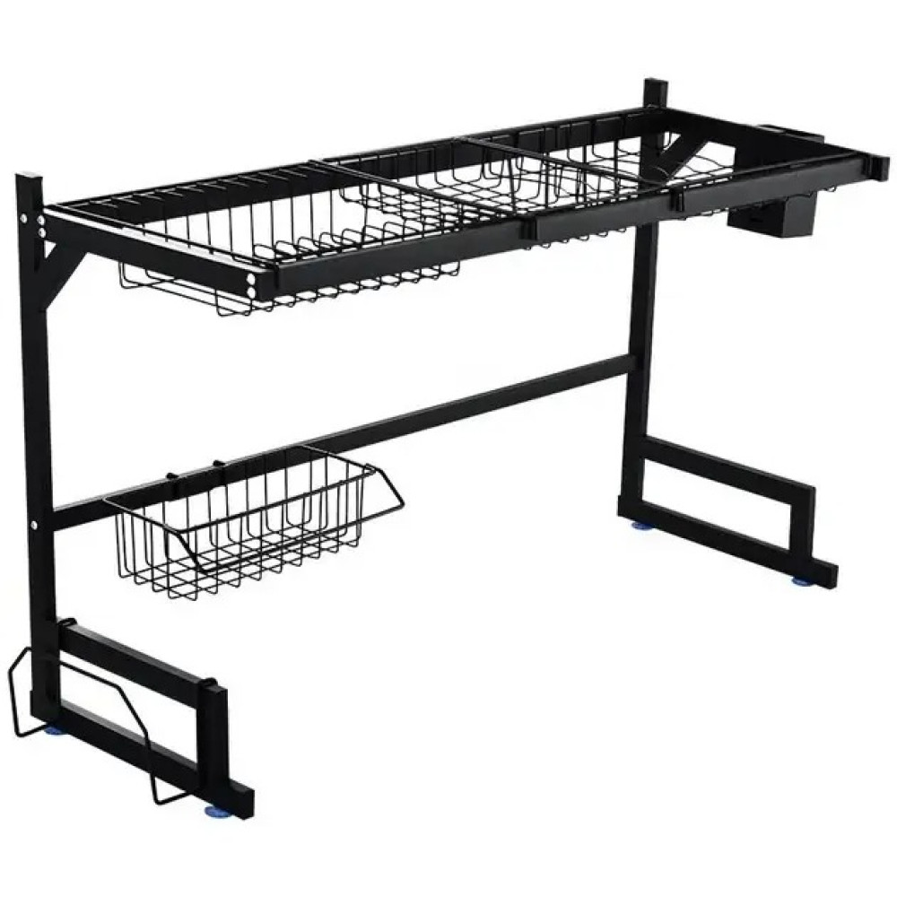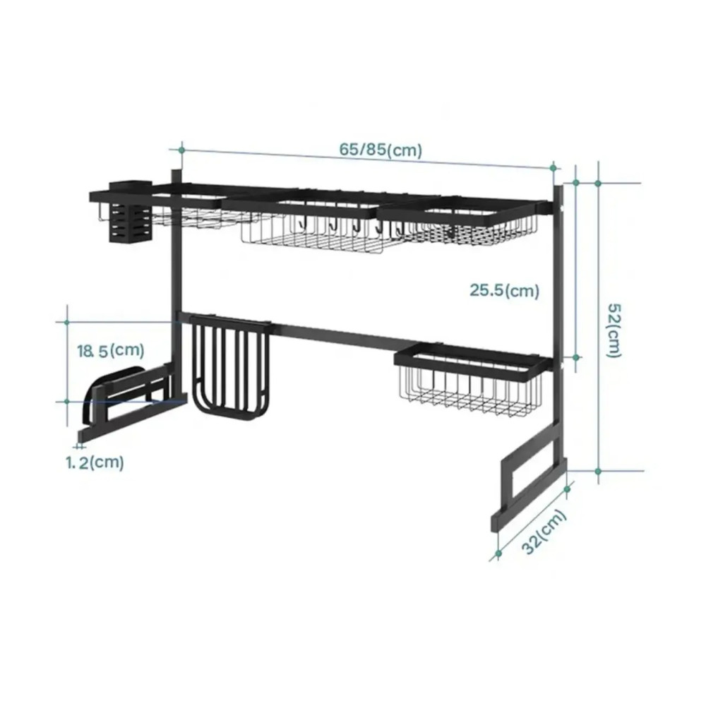 Ця регульована полиця - органайзер відрізняється великою місткістю для зберігання різних кухонних речей і компактним дизайном для економії місця. Розміщуйте миски, тарілки, столові прилади та інше кухонне приладдя в окремих кошиках. За допомогою наших органайзерів зберігання посуду стане більш ефективним, а також більш організованим. Крім того, ширину цієї полиці для сушіння посуду з нержавіючої сталі можна вільно регулювати відповідно до розміру вашої раковини, що робить її придатною для більшості побутових раковин.