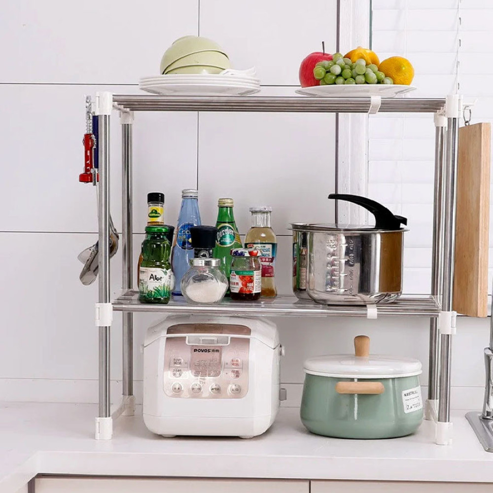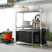 Каркас стелажу та полиці виконані з нержавіючої сталі. Кріплення зроблені з товстого пластику, що забезпечує стійкість та надійність конструкції. Стелаж не хитається і не вібрує під час роботи мікрохвильової печі. Дозволяє значно заощадити місце та організувати зберігання кухонного приладдя.
