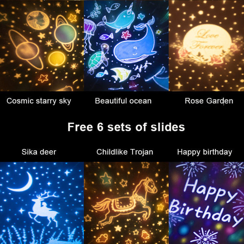 Проекційний USB нічник із обертанням (6 проекцій) білий – це проектор із функцією обертання. Нічник може відображати як проекції 1 кольором, так і 2ма і 3ма різних комбінаціях. Також кольори можуть плавно змінювати одне одного. Додатково проектор зоряного неба комплектується напівпрозорим матовим ковпаком незвичайної форми. Також, матовий ковпак дозволяє створити більш приглушене та затишне світіння. Змінюйте зображення вкладки за своїм настроєм або бажанням дитини. Це просто чудовий подарунок як дорослій, так і дитині, адже так приємно засинати під цим чарівним зоряним небом!