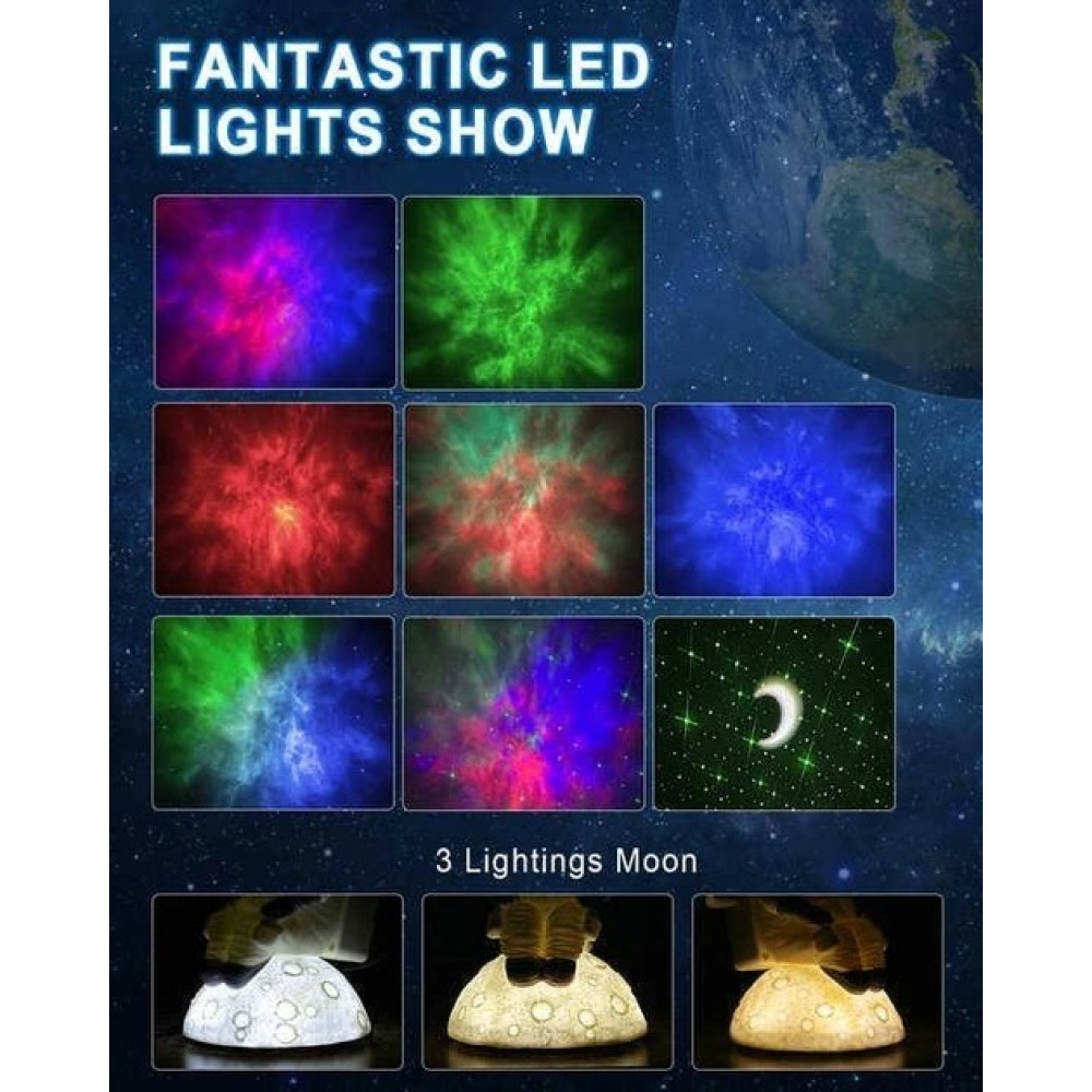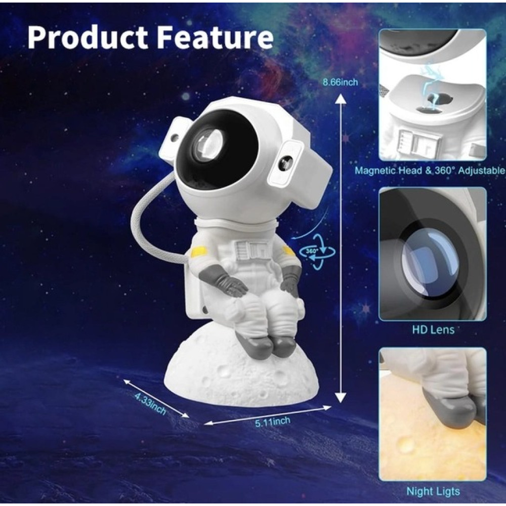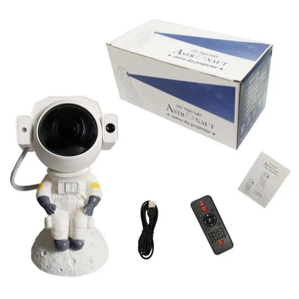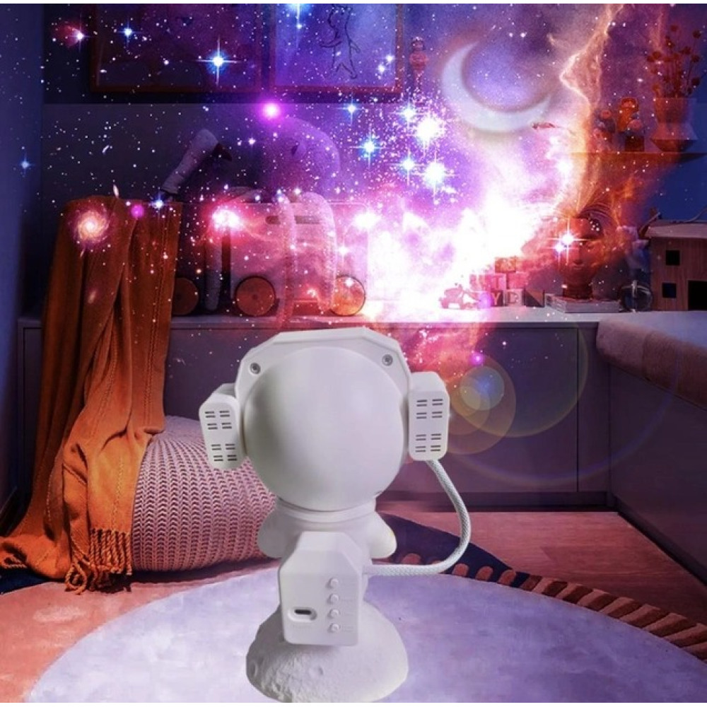 Нічник проектор зоряного неба Космонавт, він робот. Даний проектор зоряного неба має вбудовану колонку з функцією bluetooth. Світильник астронавт з місяцем, на якому він сидить, а також може проектувати місяць. Безліч налаштувань світіння здивують і дітей та дорослих.