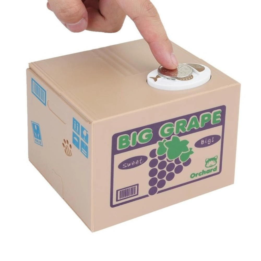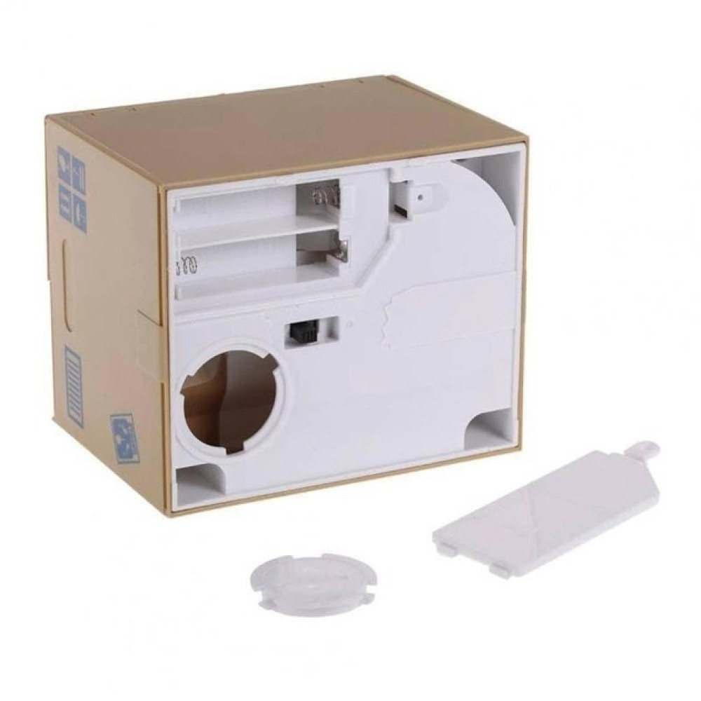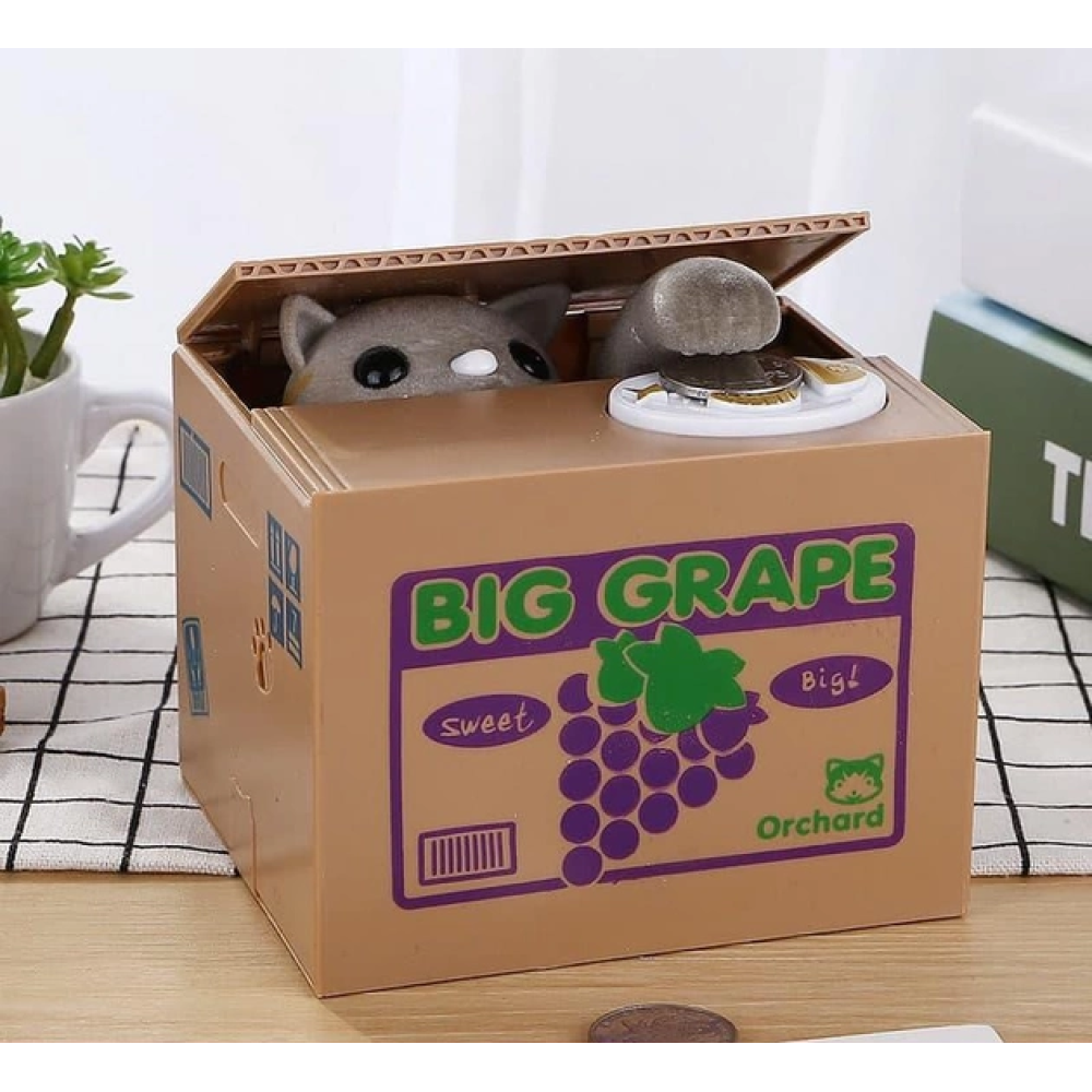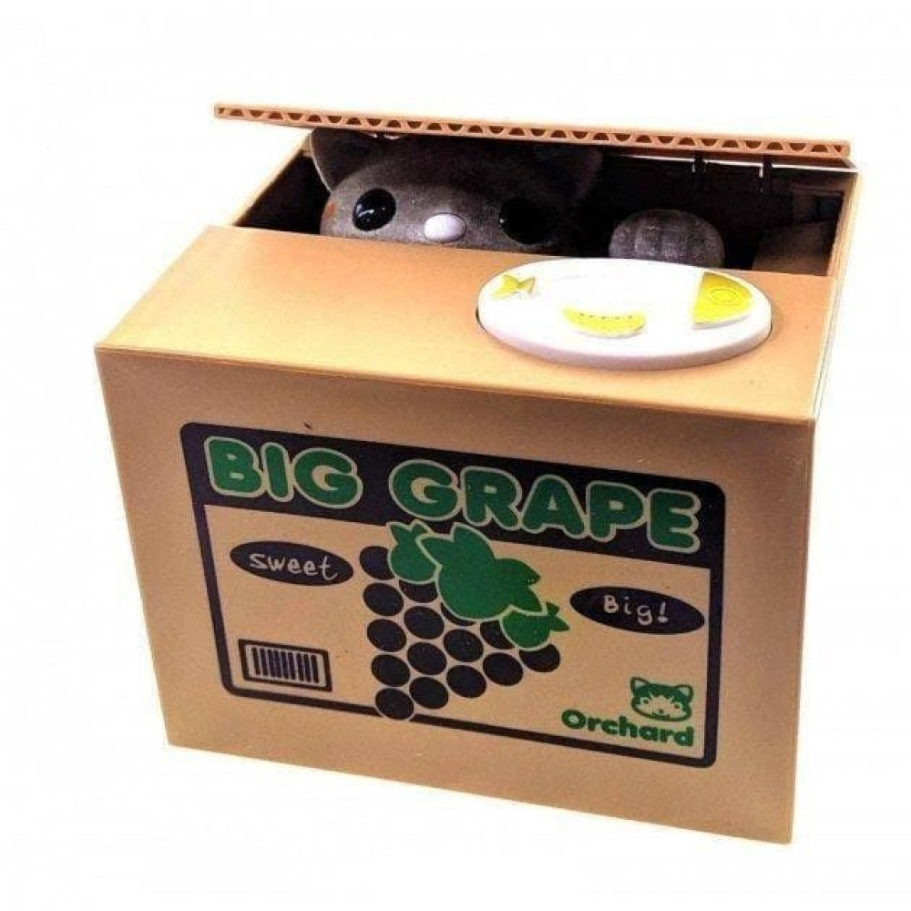 Скарбничка кіт злодюжка це невелика пластикова коробка, всередині якої ховається кіт. Якщо покласти монетку на білу площадку зверху коробки, то спрацює механізм, кришка прочиниться, кіт висуне руку і забере монетку собі. Монетки можна дістати через отвір, що відкривається на дні коробки.