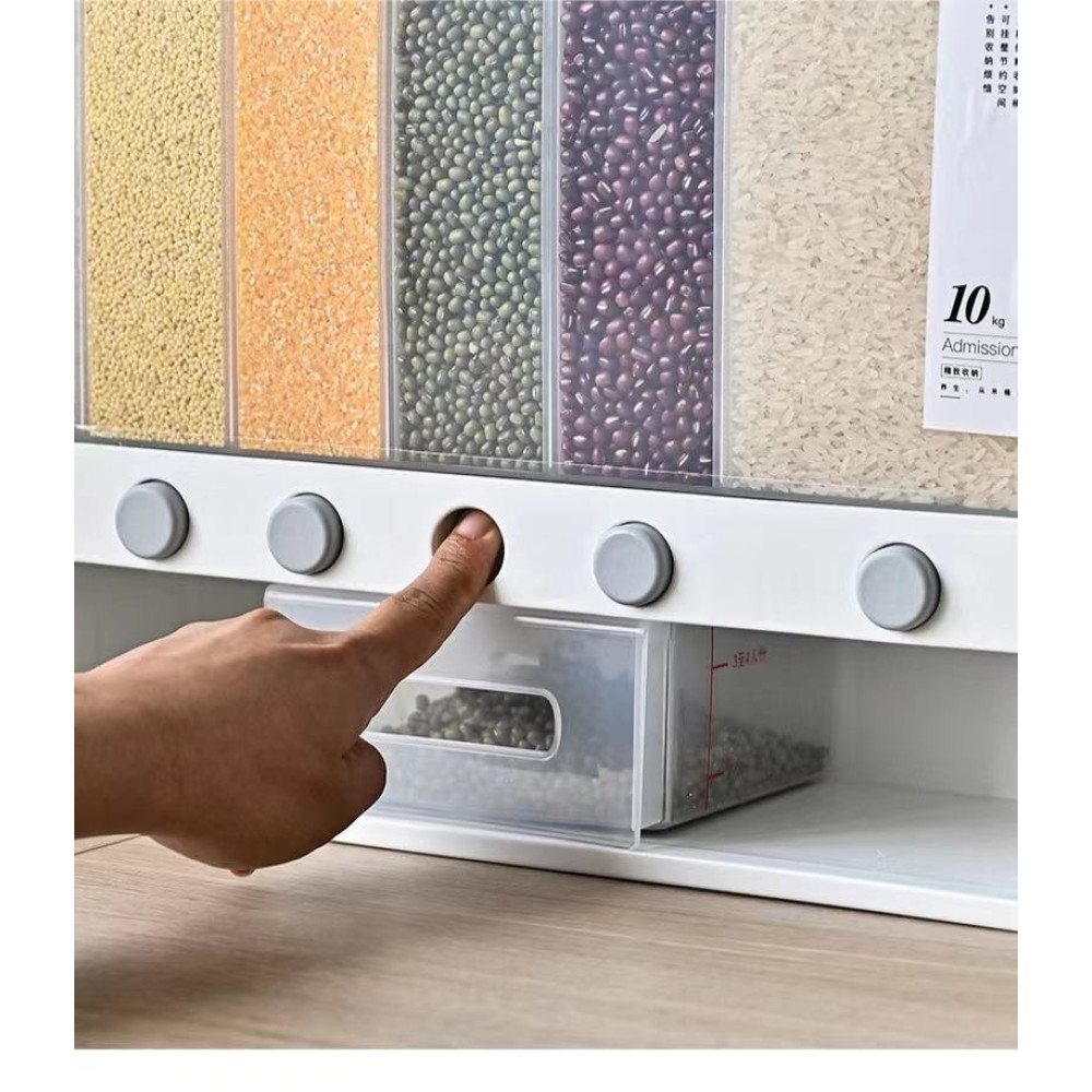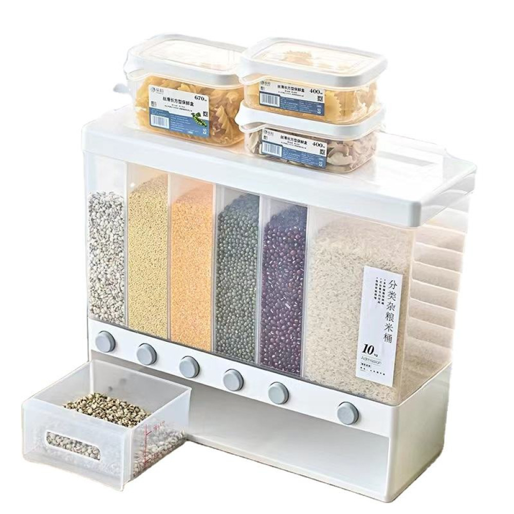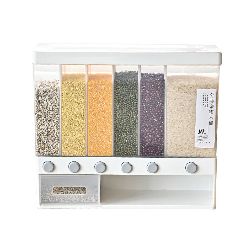 Кухонний органайзер для сухих сипких продуктів, призначений для зберігання продуктів, в ньому є шість відсіків, розділених перегородками, що знімаються, для запобігання змішування продуктів. Перегородки можна зняти збільшення обсягу тієї чи іншої відсіку. Таким чином, збільшується обсяг відсіку для улюблених продуктів, а невеликі відсіки, що залишилися, використовуються для зберігання рідше використовуваних зерен.
