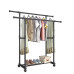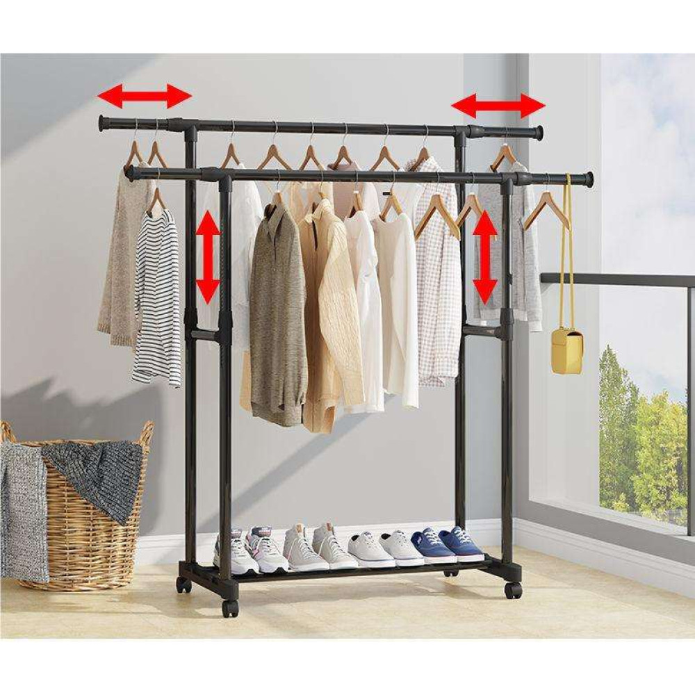 Пластикові заглушки на кінцях труб, що випирають, зібраної конструкції, захистять одяг і запобігають випадковому падінню одягу якщо він буде просто накинутий на стійку. Великим плюсом стійки для одягу Double Pole Clother Hose є наявність невеликих коліщатків, завдяки яким Ви зможете пересунути стійку навіть повністю завішаний одягом. Стійка Double Pole Clother Hose виконана двоповерховою, для впорядкування і нормального, компактного, розміщення одягу на ній. Бічні поперечні планки зручні для розміщення на них, наприклад, випрасуваних штанів. Найкраще для стійки використовувати вішалки, так що одягу можна розмістити в рази більше.