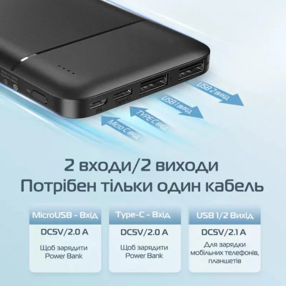 Все разъеми аксессуара расположени в одном из его торцов и представлени разъемами Micro-USB и Type-C, предназначенними для подзарядки двумя USB портами, для зарядки смартфонов или планшетов. Ёмкость повербанка составляет 10000mAh, а наибольшая сила виходного тока – 2.1А. Модель имеет защиту от перегрева, короткого замикания, перезаряда и скачков напряжения, что предохранит ее и заряжаемие гаджети от повреждений.