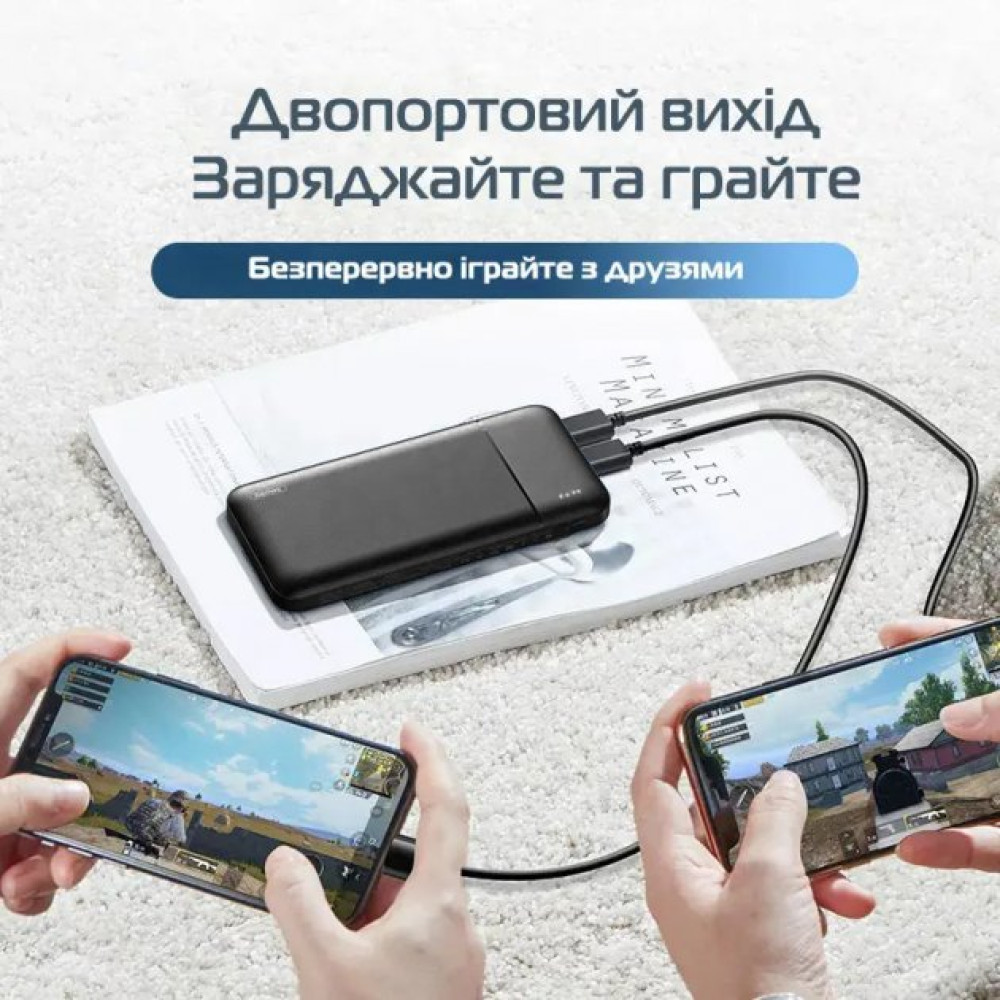 - Power Bank оснащен двумя USB портами для подзарядки других устройств, сила виходного тока каждого из портов составляет 2,1А. То есть ви можете заряжать 2 устройства одновременно.