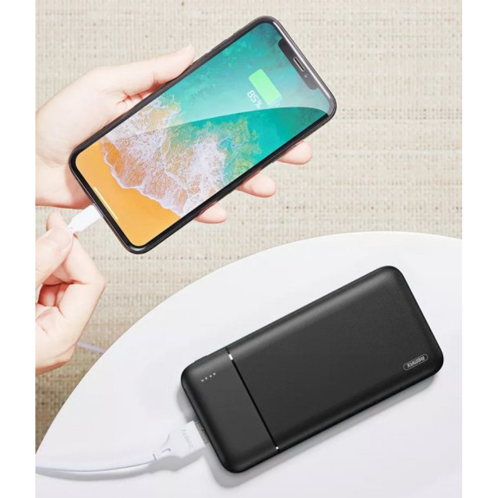 - Power Bank Remax изготовлен из пластикового ABS, удобно держится в руке благодаря текстурной поверхности и имеет только одну механическую кнопку включения/виключения, находящуюся на боковой части корпуса.