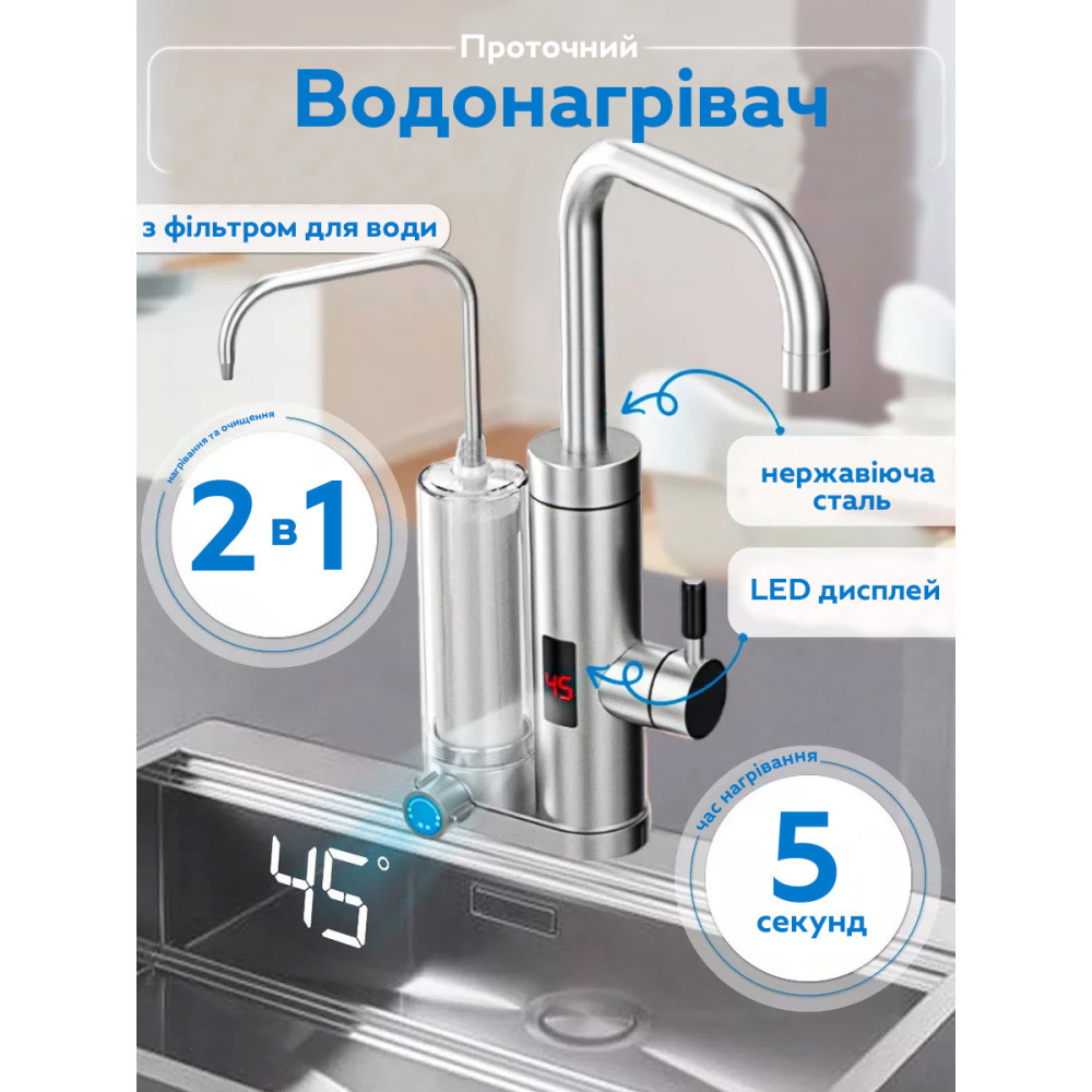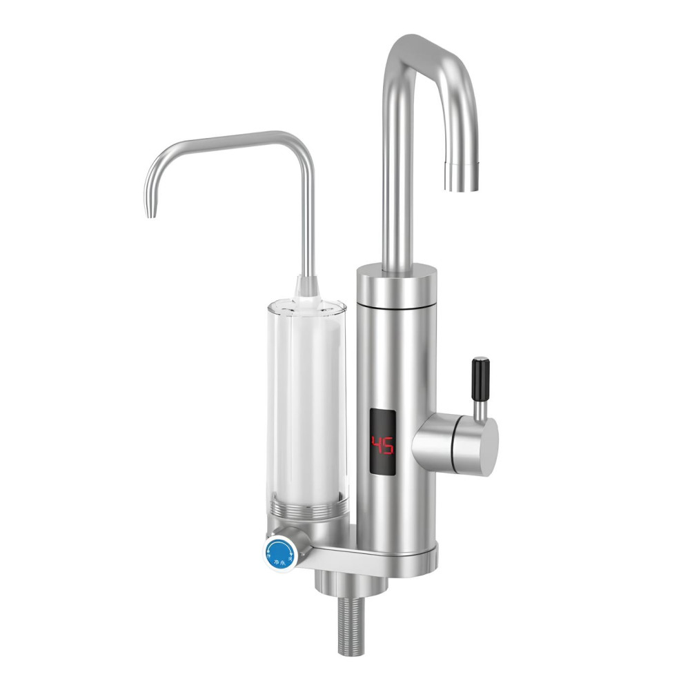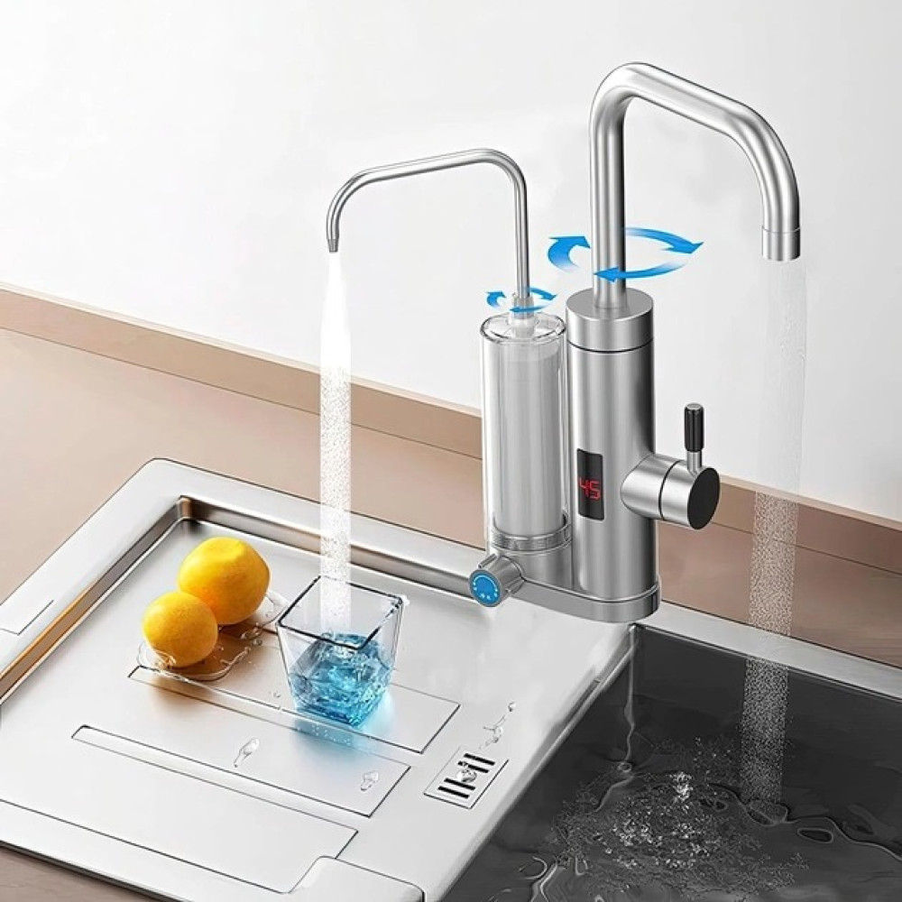 Водонагрівач оснащений двома кранами, один з яких має вбудований нагрівальний елемент, здатний нагріти воду всього за 3 секунди і підтримувати задану температуру протягом тривалого часу, а другий кран оснащений багатоступінчастим фільтром для очищення води, цей пристрій гарантує отримання як гарячої, так і чистої води у вашому будинку.