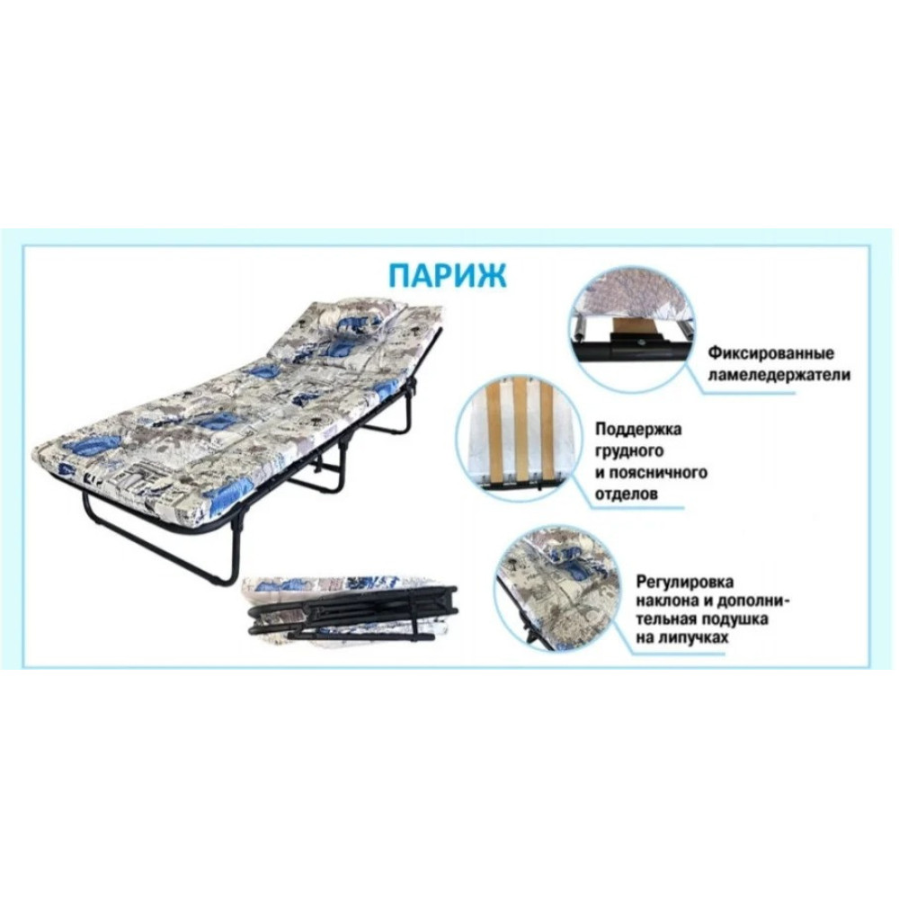Розкладачка «Париж» - комфортна розкладачка з незнімним матрацом 6см. і подушечкою біля узголів'я. Оббивка матраца – двошарова. Зверху бязь, яка має відмінну повітропроникність, усередині поролон 6 см., а нижній шар складається з поліпропіленової тканини.