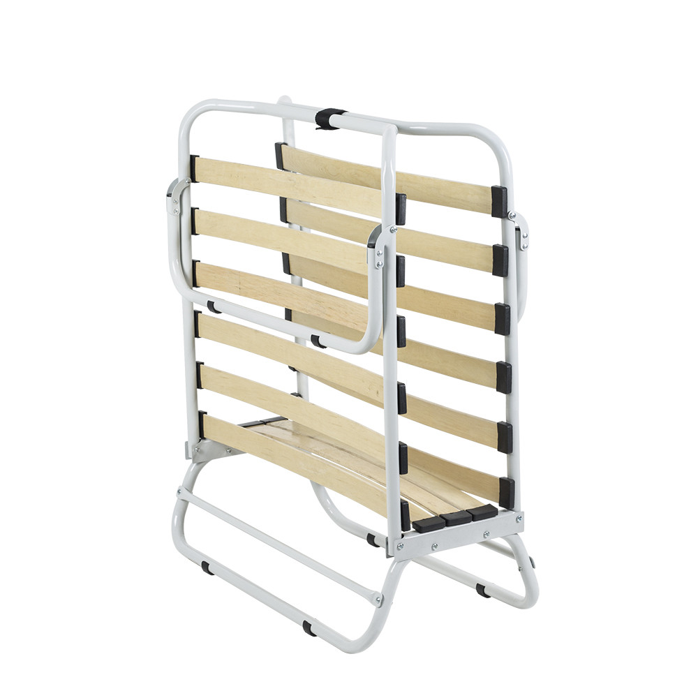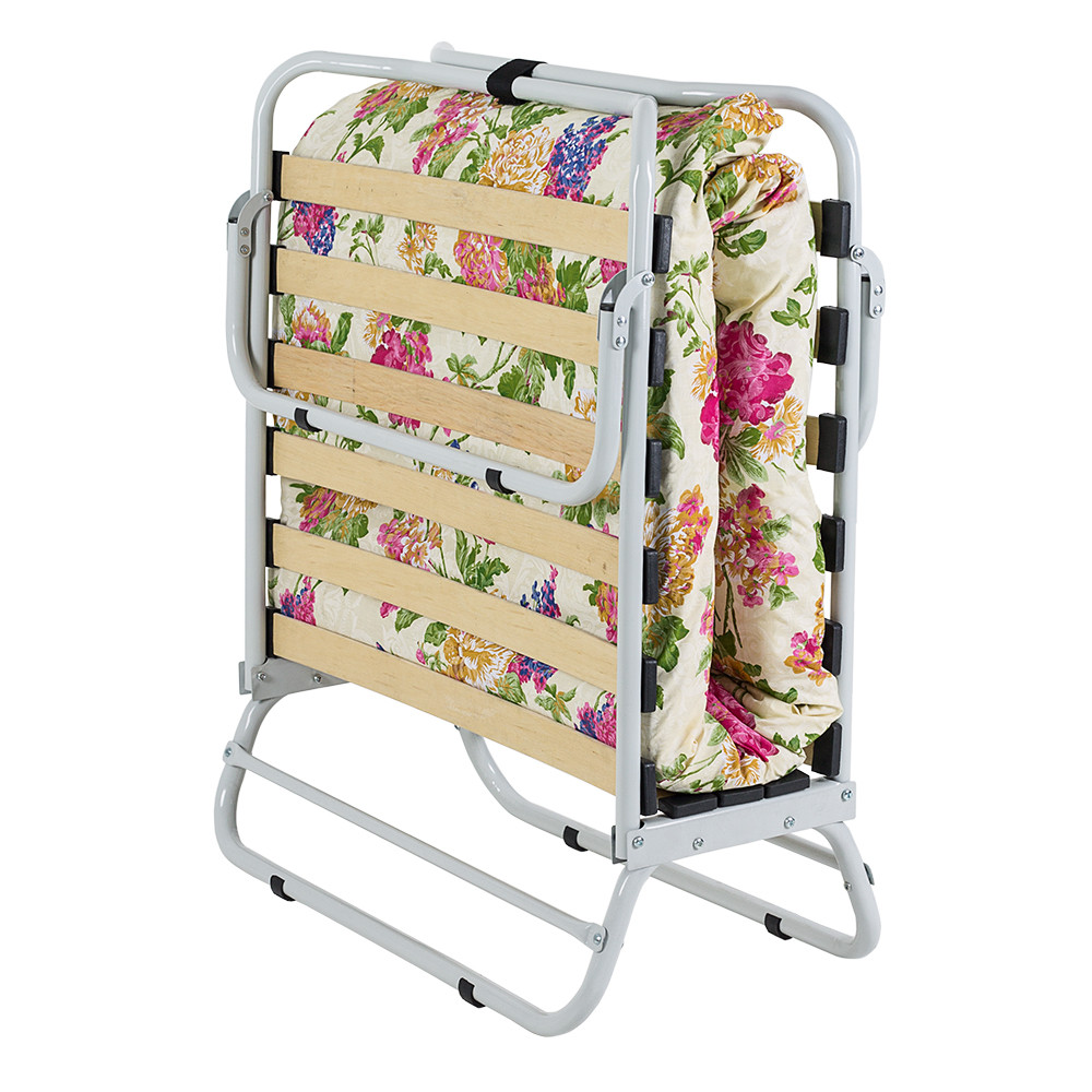 А у складеному вигляді ліжко займає мінімум місця (як розкладачка) – 1050*820*420 мм. Спати на ній можна повноцінно та комфортно: спина не прогинається, а також спляча людина розташована вище від підлоги, ніж на розкладачку. Поступово розподілені по всьому периметру ламелі не продавлюють матрац, що важливо при частому її використанні. «Ліжко на ламелях» має ортопедичний ефект, а завдяки міцному каркасу здатне витримувати досить високе навантаження до 120 кг. Матрац виготовлений з якісної зносостійкої тканини «Бязь Голд 125г/м2» приємного забарвлення, наповненого повстю та синтепоном товщиною 50 мм. Каркас відрізняється підвищеною міцністю, виготовлений із металевих труб Ø25мм, з полімерним покриттям.
