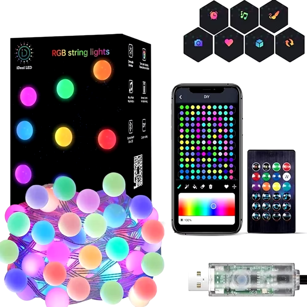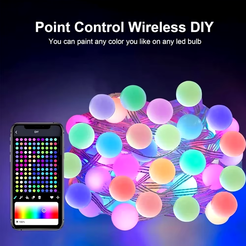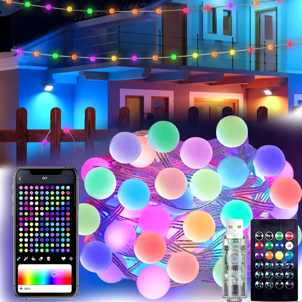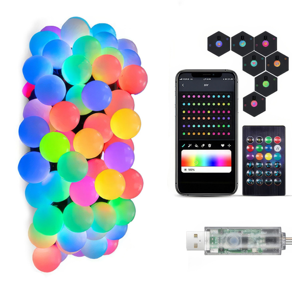 Гірлянда - це стильна й універсальна прикраса для створення святкової атмосфери та затишного освітлення. З довжиною 10 метрів і 50 матовими кульками, гірлянда пропонує м'яке та рівномірне світіння, що підходить для внутрішнього та зовнішнього використання. Керування можна здійснювати за допомогою мобільного додатку через Bluetooth або зручного пульта ДУ. Гірлянда живиться від USB, що спрощує її використання, роблячи можливим під'єднання до різних пристроїв і зовнішніх акумуляторів.