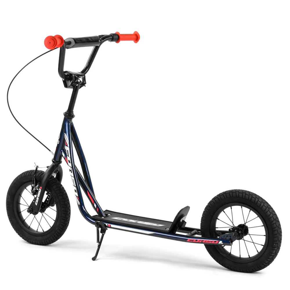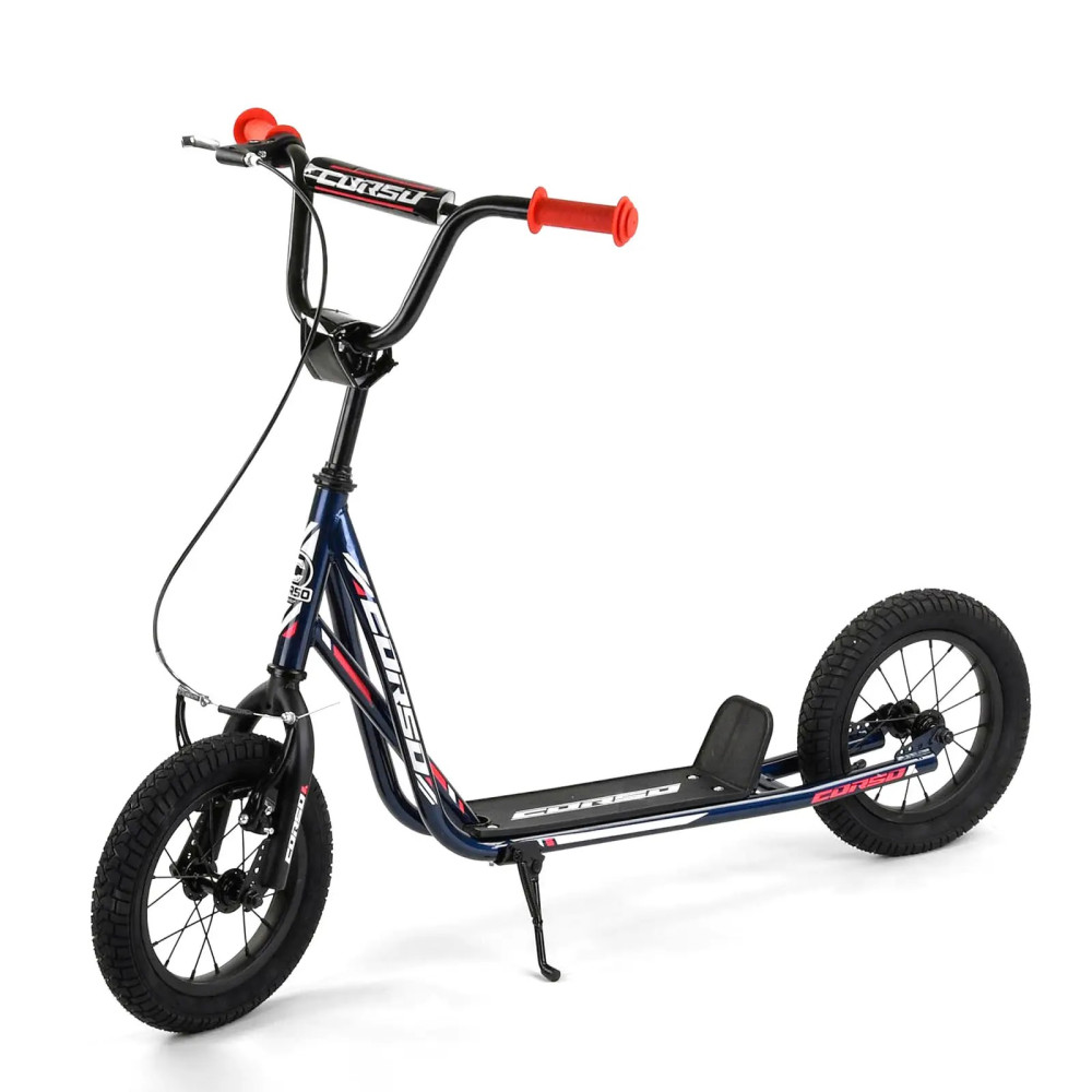 V-подібне кермо надійно кріпиться до рами самокату, регулюється по висоті від 83 см до 93 см. Особливістю даної моделі стали надувні гумові колеса. Завдяки таким колесам прохідність самокату збільшується. На ньому можна їздити не тільки асфальтом і рівною дорогою, але і грунтовою дорогою і тротуарною плиткою.