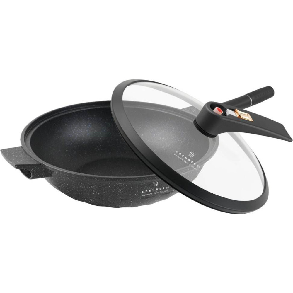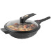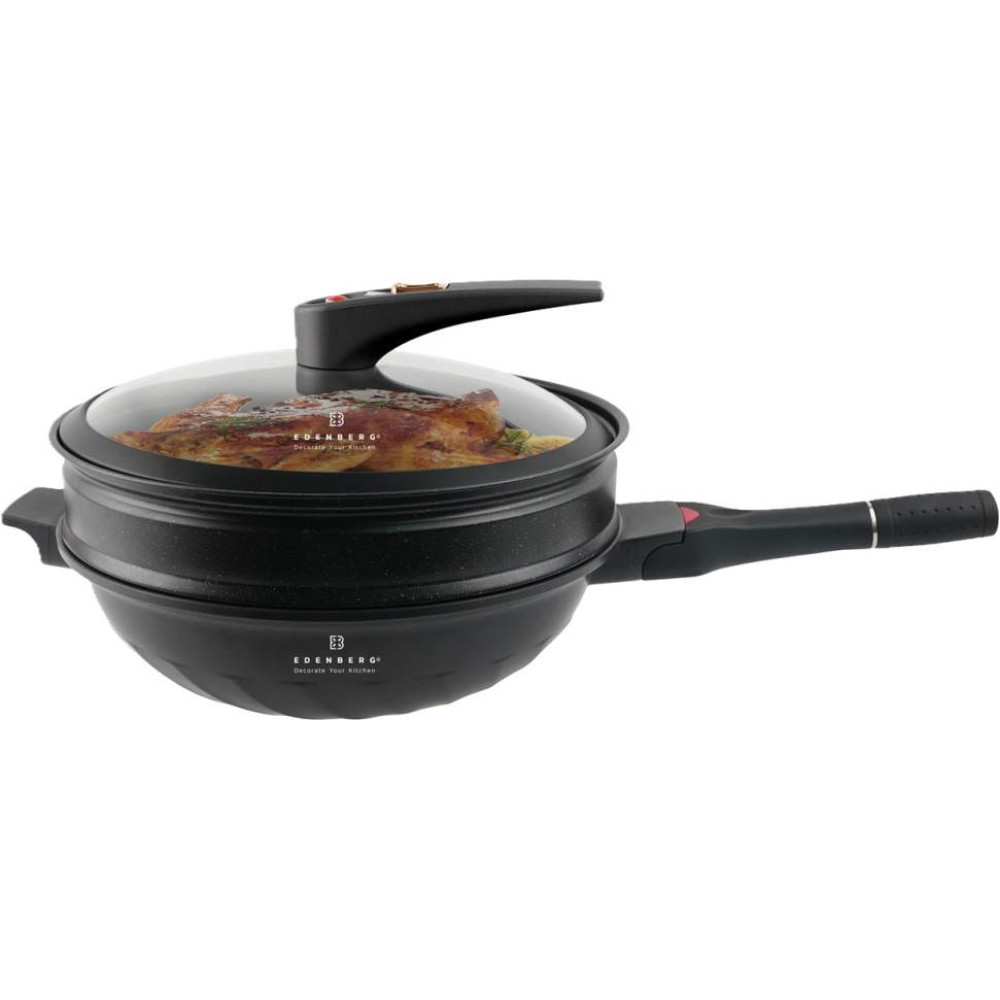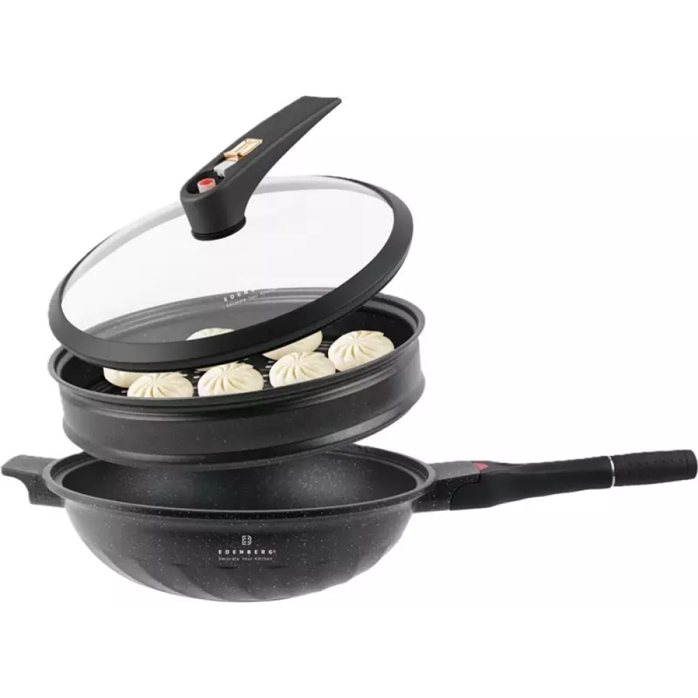 Багатофункціональна сковорода діаметром 32 см призначена для шанувальників зручності та різноманітності на кухні. Вона поєднує функції ока, сотейника та пароварки, що дає змогу готувати будь-які страви швидко та легко. Ця модель обладнана скляною кришкою з мікрозатискачем, що дає змогу їй працювати як скороварка, зберігаючи вітаміни та корисні властивості продуктів.