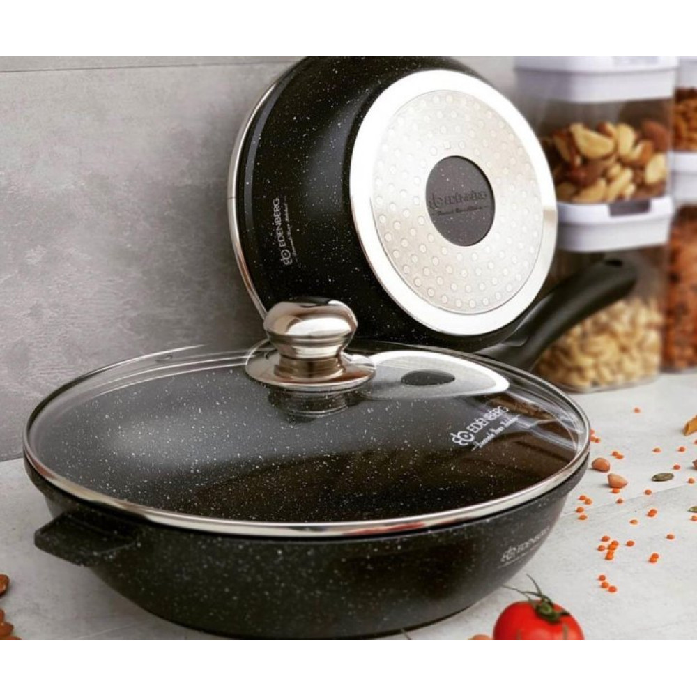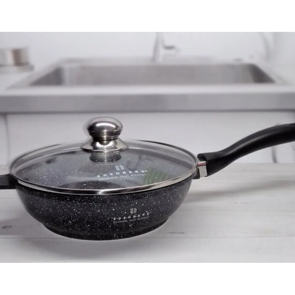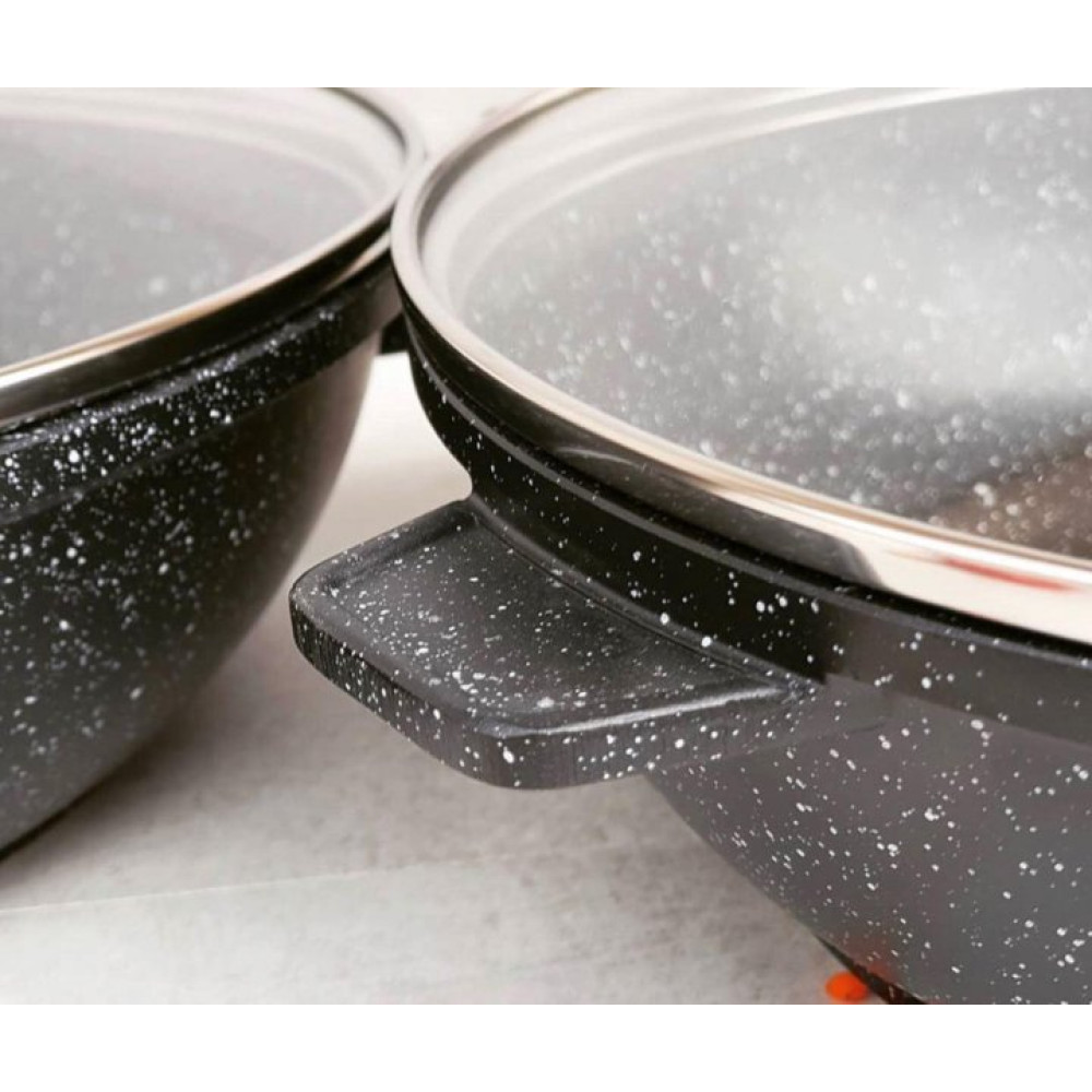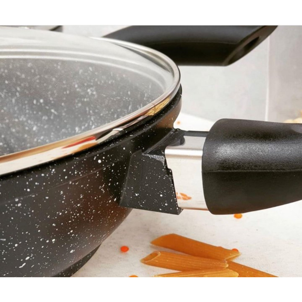 Сковорода глибока з алюмінію та має глибоке антипригарне мармурове покриття. Кришка виконана з термостійкого скла з отвором для виходу пари.