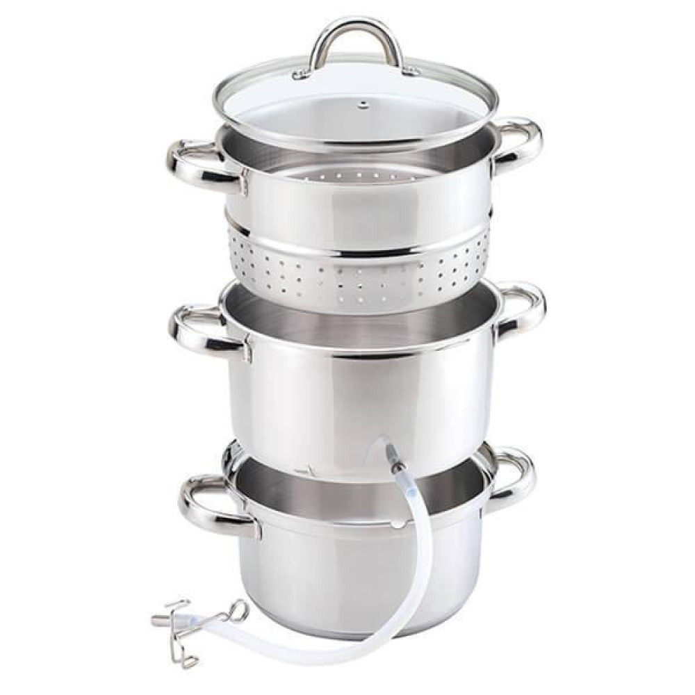 Соковарка A-plus виготовлена з нержавіючої сталі загальним об'ємом 8 літрів. Головне призначення посуду – виробництво натурального соку з таких продуктів як яблука, виноград, груші, абрикоси та ягоди. Все це можливо в домашніх умовах, часто використовується каструля - соковарка на дачі, де відразу з городу можна випарювати натуральний сік. Соковарка Edenberg цілком реально використовувати для приготування на пару будь-яких продуктів. Сік із соковарки не потребує подальшої термічної обробки, що дозволяє економити ваш дорогоцінний час.