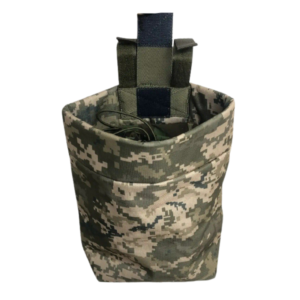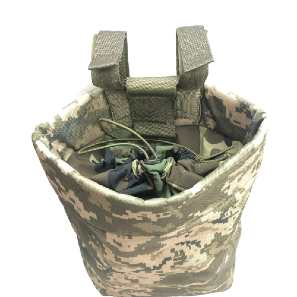 Сумка для скидання порожніх магазинів є практичним контейнером для боєприпасів або іншого спорядження. Завдяки відкидному мішку немає необхідності складати порожні магазини назад, що заощаджує час, запобігає повторному використанню порожнього магазину та захищає від бруду. Виготовлена з Cordura 500D – якісного та зносостійкого матеріалу, що забезпечить захист від механічних пошкоджень та тривалий термін експлуатації. Горловина має систему швидкого стягування, що дозволяє при необхідності моментально закрити сумку. Така конструкція надійно захищає магазини та інше спорядження від випадання. Знизу передбачена спеціальна сітка, що виконує роль дренажного люверсу та забезпечує хорошу циркуляцію повітря. За допомогою строп сумку можна прикріпити на спорядження чи поясний ремінь.