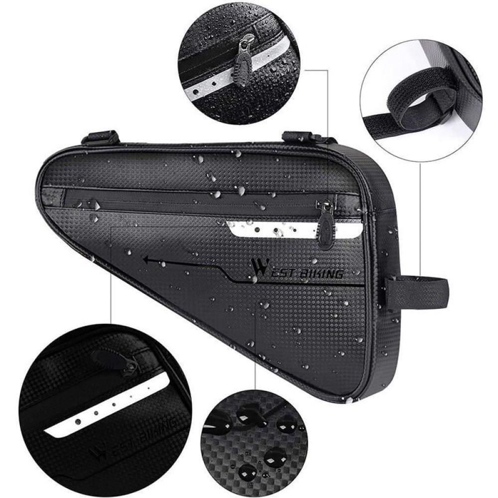 Підходяще місце для зберігання предметів це трикутний бардачок об'ємом 4л. по вибоїстій або кам'янистій дорозі. Підходить для більшості гірських, шосейних та міських велосипедів. Тонкий і дуже легкий корпус ефективно мінімізує опір вітру і запобігає зачіпання ногами під час поїздки.