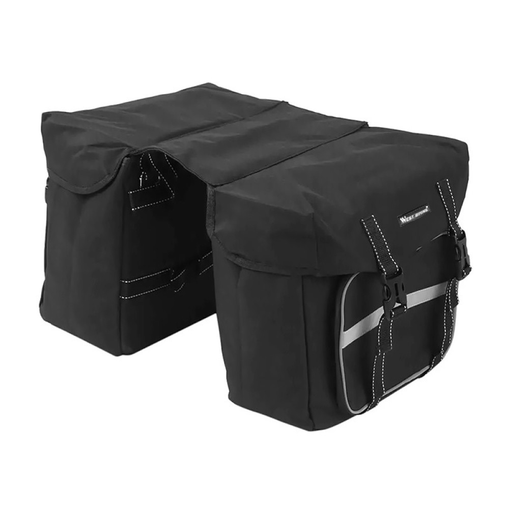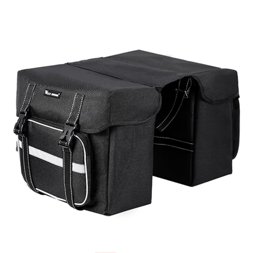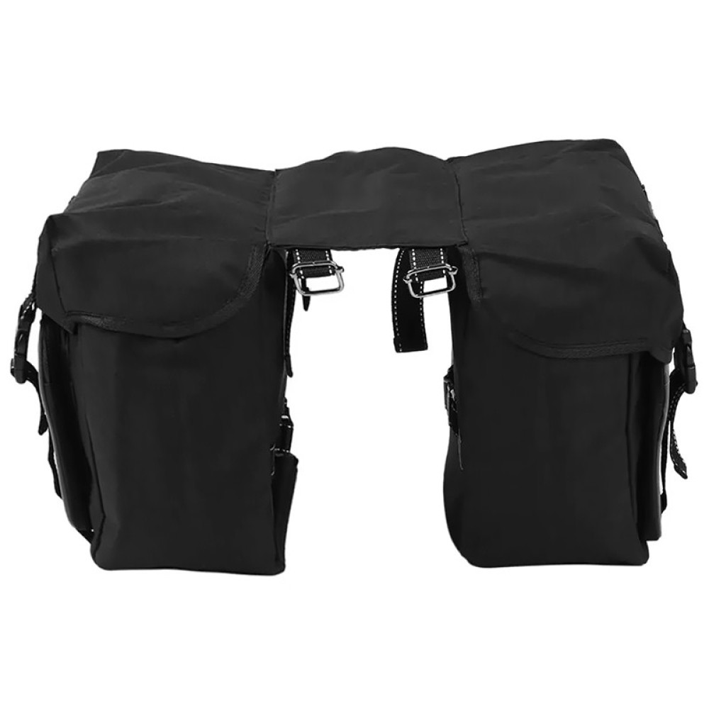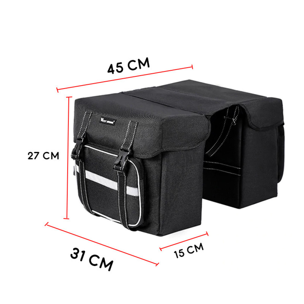 Сумка пошита у вигляді двох секцій, з'єднаних тканинною перегородкою між собою. За рахунок такого дизайну вага речей, що перевозяться, акуратно розділяється по обидва боки багажника. У той же час таке розміщення не впливає на рівновагу та керованість велосипеда. Виготовлено сумку із міцної тканини, яка захищає від опадів та можливих ударів. До того ж завдяки особливому складу матеріалу аксесуар легко чистити від більшості видів забруднювачів. Продумана система кріплень якісно фіксує сумку на багажнику велосипеда, за винятком розбовтування та зміщення аксесуара при їзді. Загальний об'єм сумки становить 12 л, чого достатньо для комфортного перевезення всього необхідного. Кожен відсік закривається окремими поясами, які фіксуються на клямку. Для перевезення предметів першої необхідності, на кшталт лікарських засобів чи ремонтних комплектів, із боку основних відсіків розташовані додаткові відділення на блискавці.