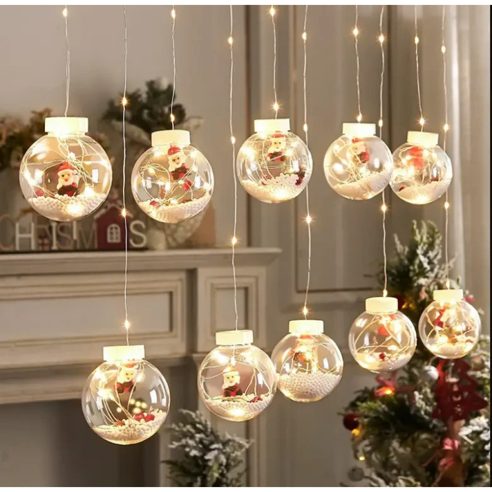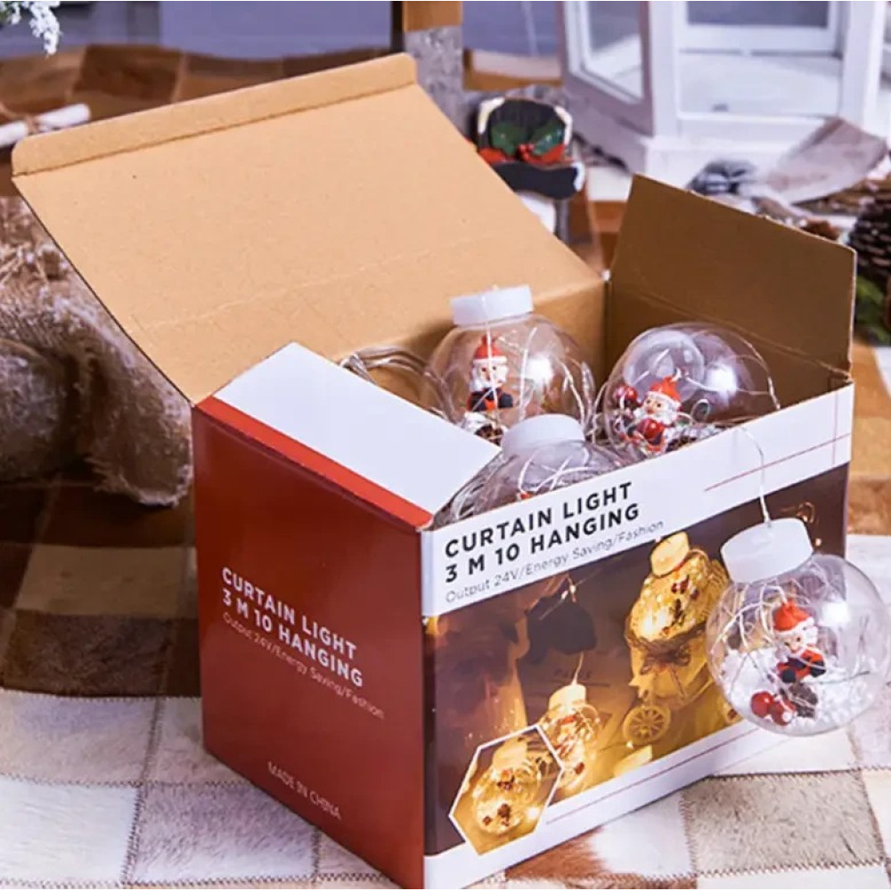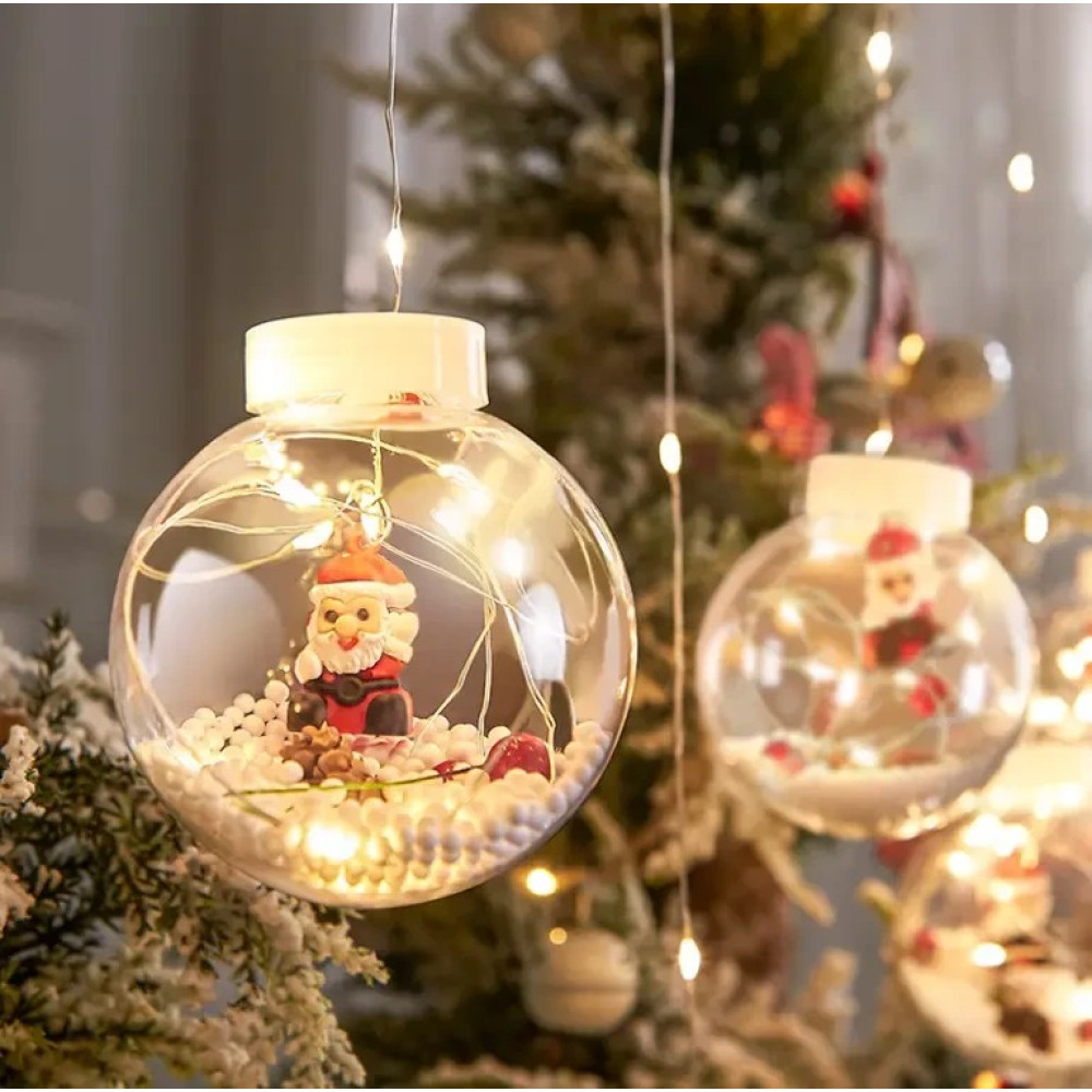 - У кожній кулі красива, яскрава фігурка Діда морозу, дрібні кульки, що імітують іскристо-білий сніг і світлодіоди, що мерехтять гарним теплим світлом.