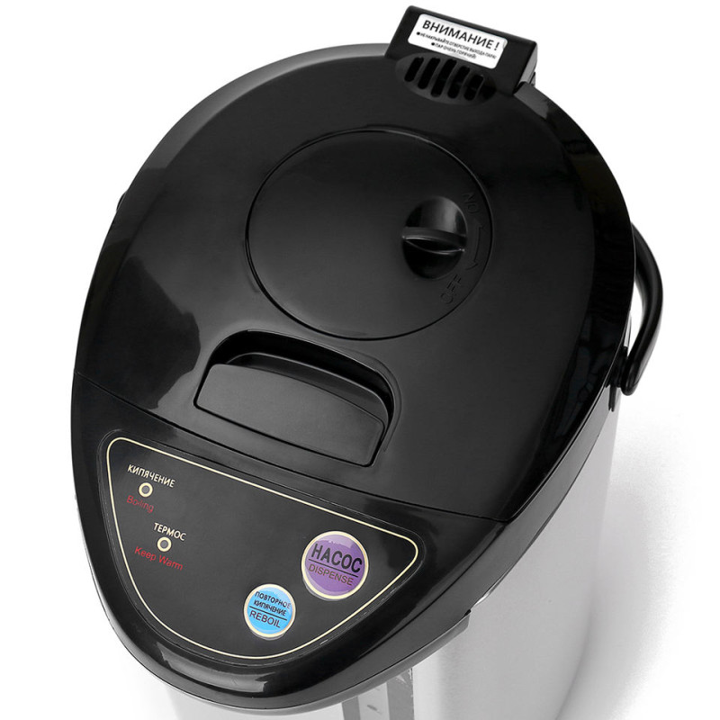 Цей прилад - термопот, має корпус та внутрішню ємність з нержавіючої сталі, а також 3 режими роботи: кип'ятіння, підтримання температури та повторне кип'ятіння. Вибір способу подачі води – ручний насос, електронасос чи автоматична подача.