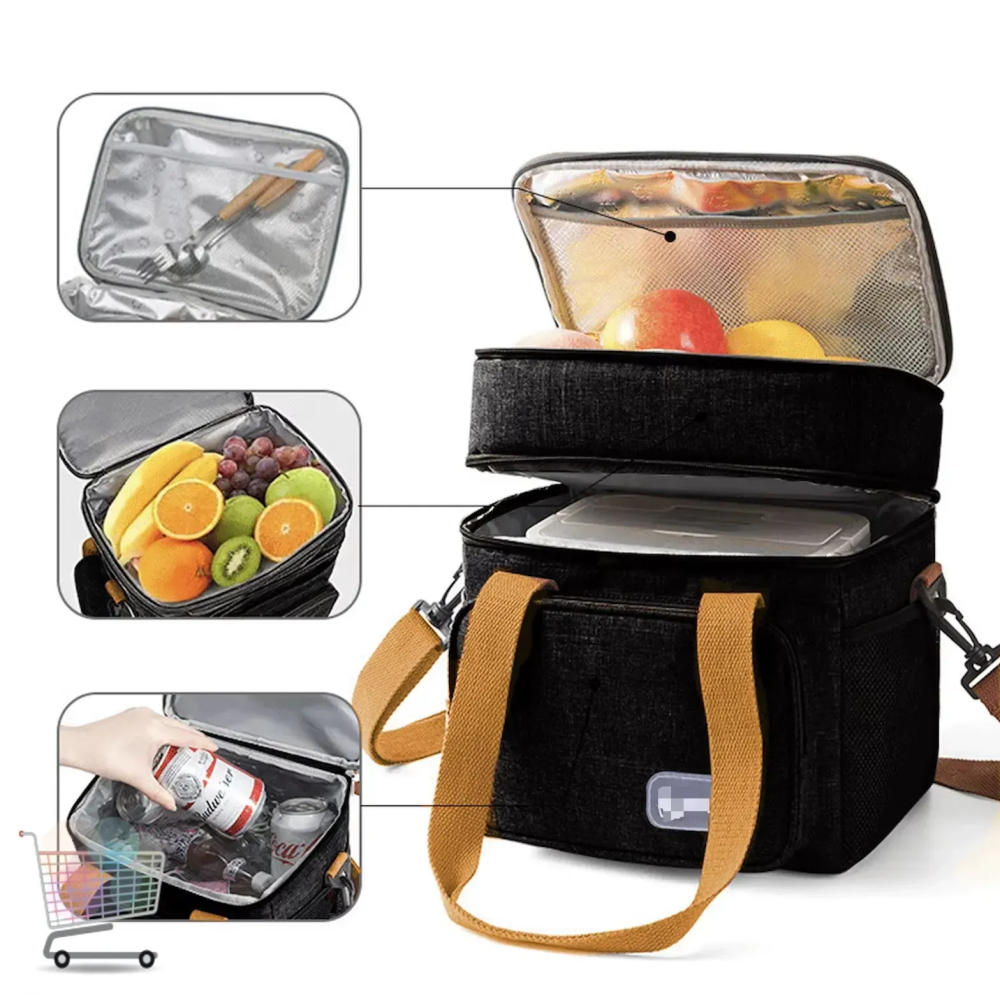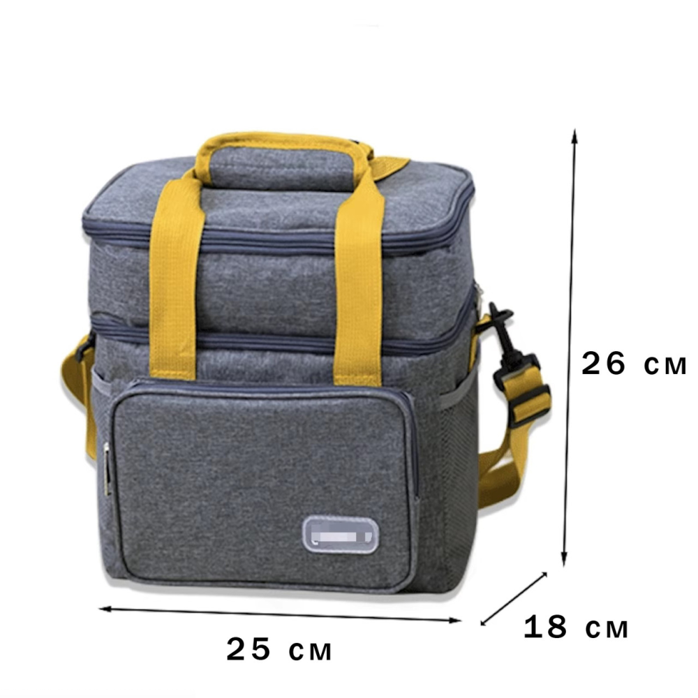 - Дворівнева конструкція: Верхній відсік для зберігання фруктів, снеків або дрібних предметів, нижній - для контейнерів з їжею, напоїв або ланч-боксів.