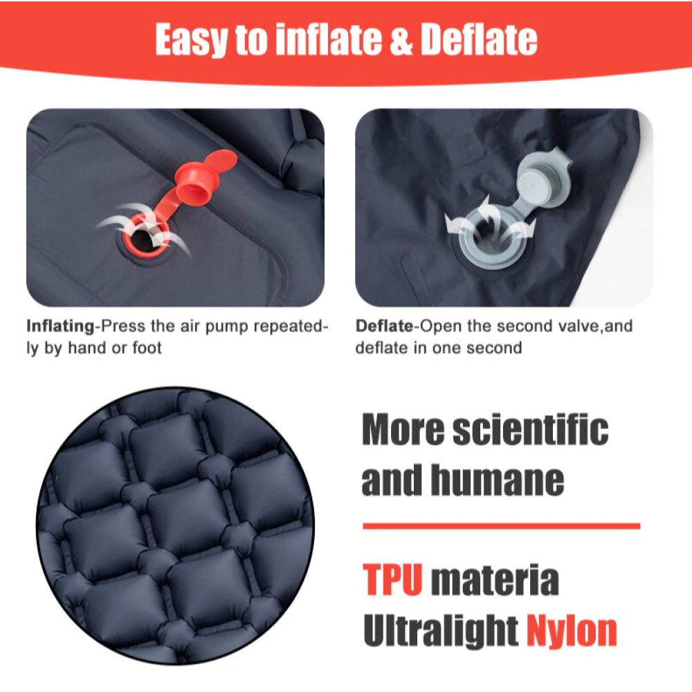Обладнаний зручним чохлом для транспортування. Килимок автоматично втягує повітря всередину, тому вам нічого не потрібно робити, щоб розгорнути його! Він легкий і зручний для перенесення.