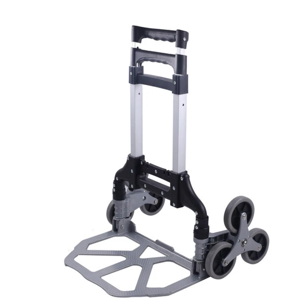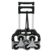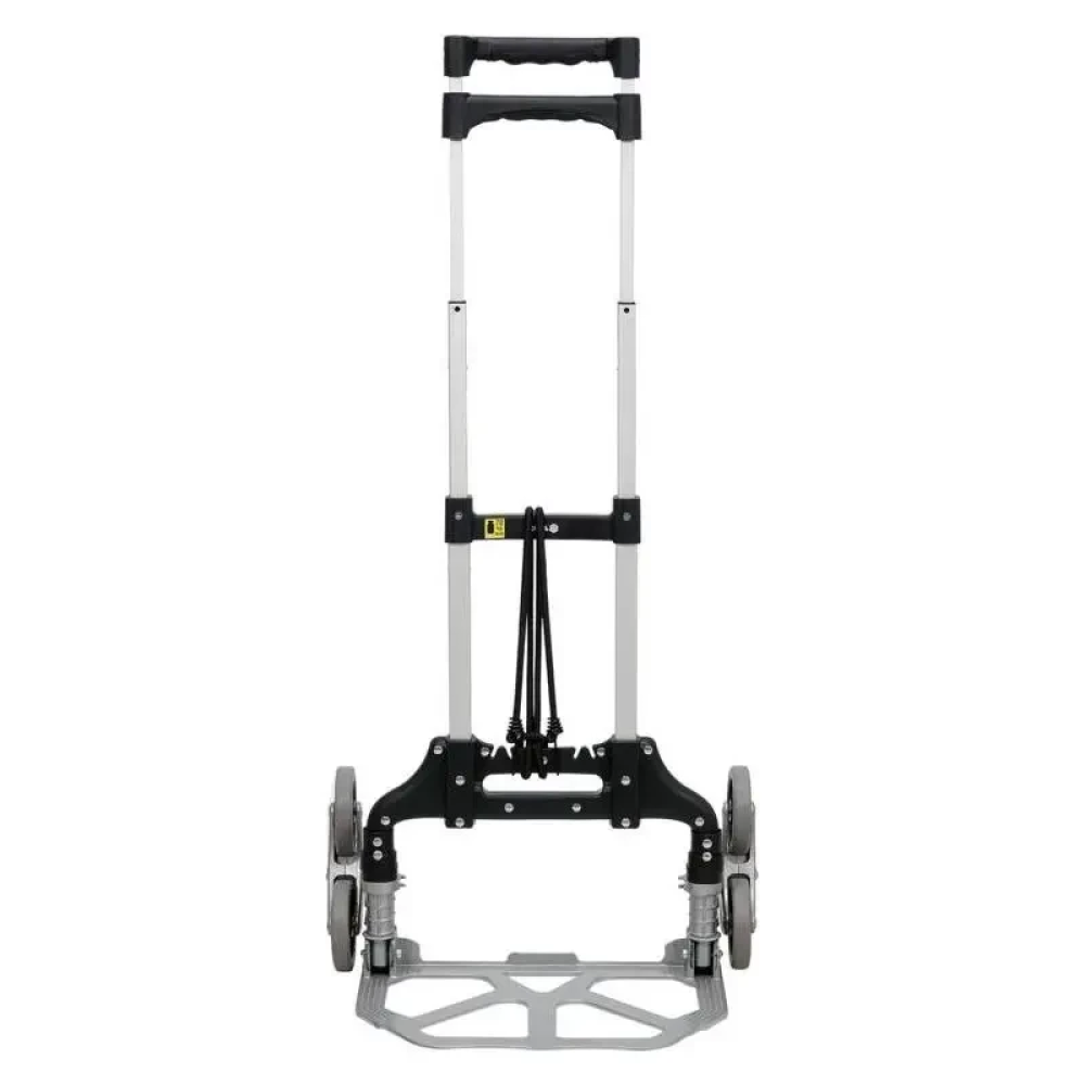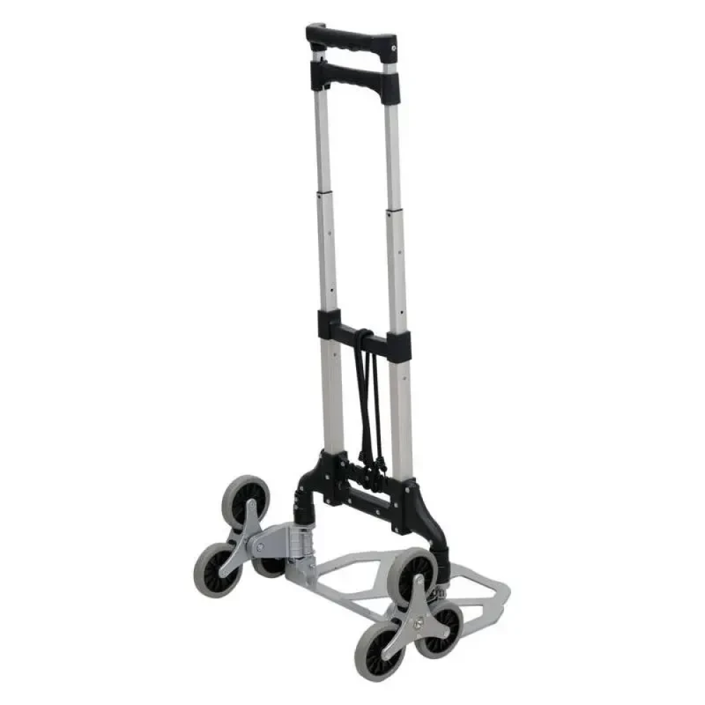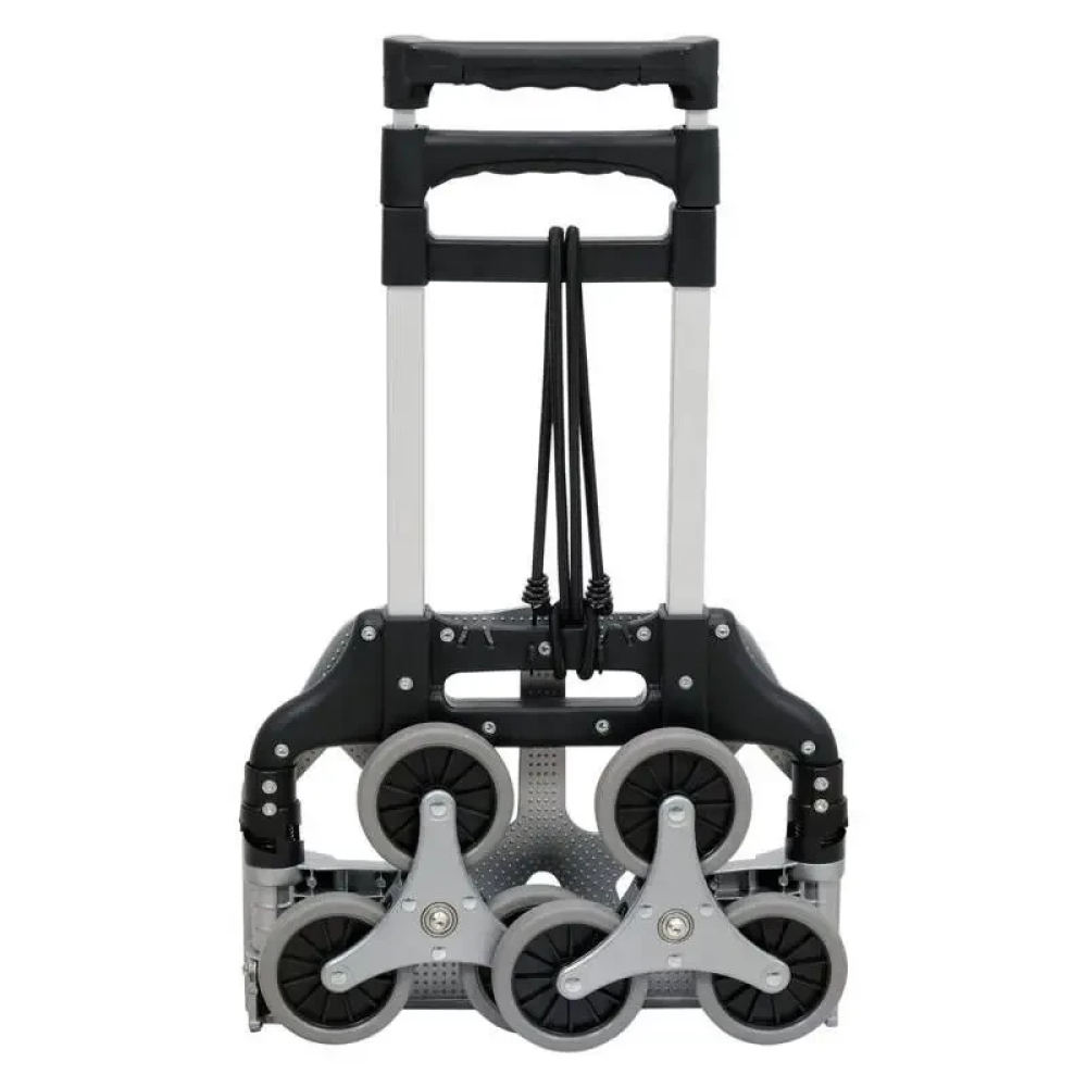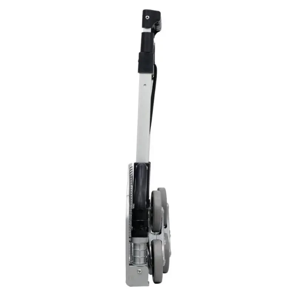Складний алюмінієвий візок призначений для переміщення вантажів, включно з їхнім підйомом і опусканням по сходах. Він оснащений міцною рамою з алюмінію, потрійними гумовими колесами і складною платформою, що робить його ідеальним для транспортування коробок, ящиків та іншої упаковки. Візок підходить для переміщення вантажів вагою до 70 кг на рівній поверхні і до 35 кг під час транспортування сходами. Завдяки конструкції коліс, розташованих трикутником, візок легко «крокує» сходами, забезпечуючи зручність і стабільність під час підйому та спуску.