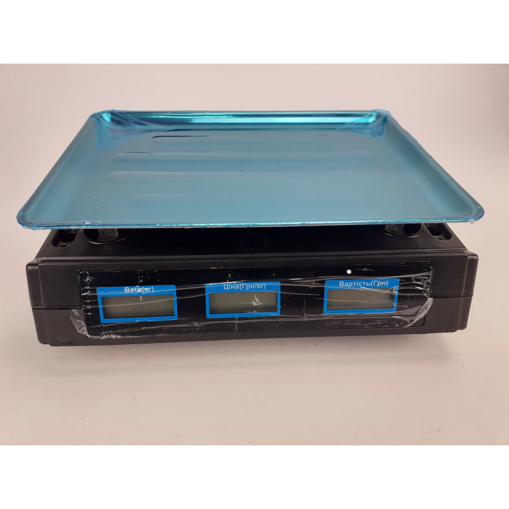 Верхня частина платформи на яку поміщаються продукти, що зважуються, зроблена з металу для додаткової міцності і надійності. Ваги мають великий дисплей з підсвічуванням, рівень освітлення якого можна додатково регулювати. Модель має 7 виділених кнопок для фіксації цін продуктів, що часто купуються, а також підтримує функцію тарування. Корпус торгових ваг зроблений із міцного товстого пластику.